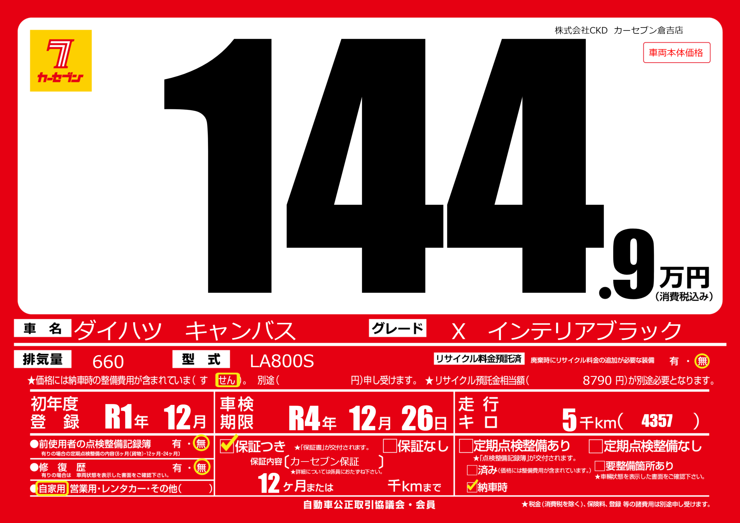 | 車名 | ダイハツ キャンバス | グレード ミッション 排気量 |