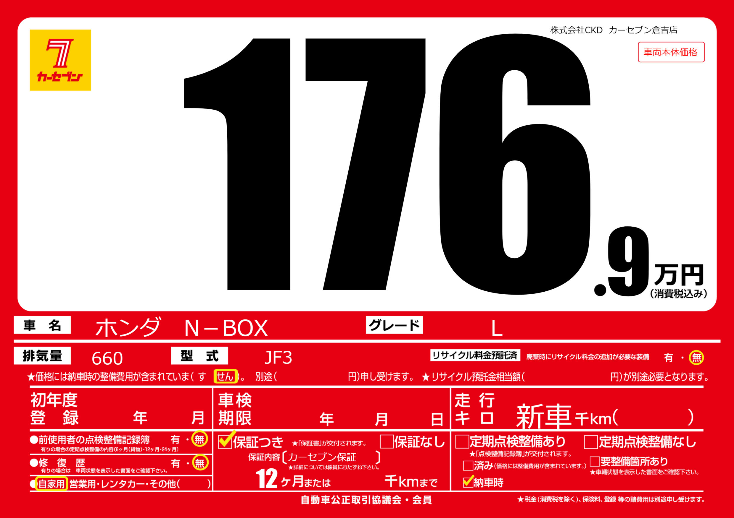 | 車名 | ホンダ N-BOX | グレード ミッション 排気量 |
