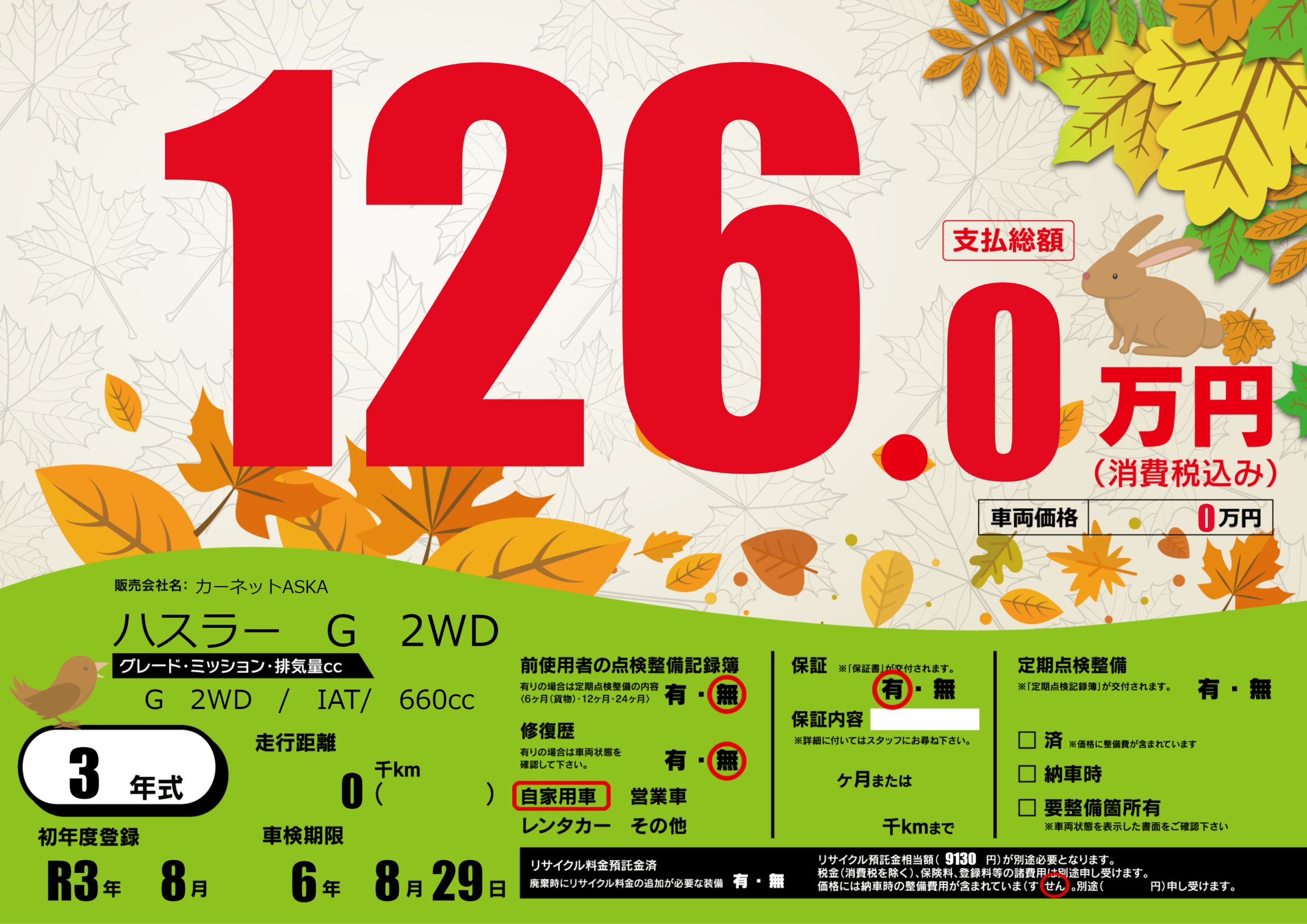 | 走行キロ | - | 初年度登録 | R3年8月 |