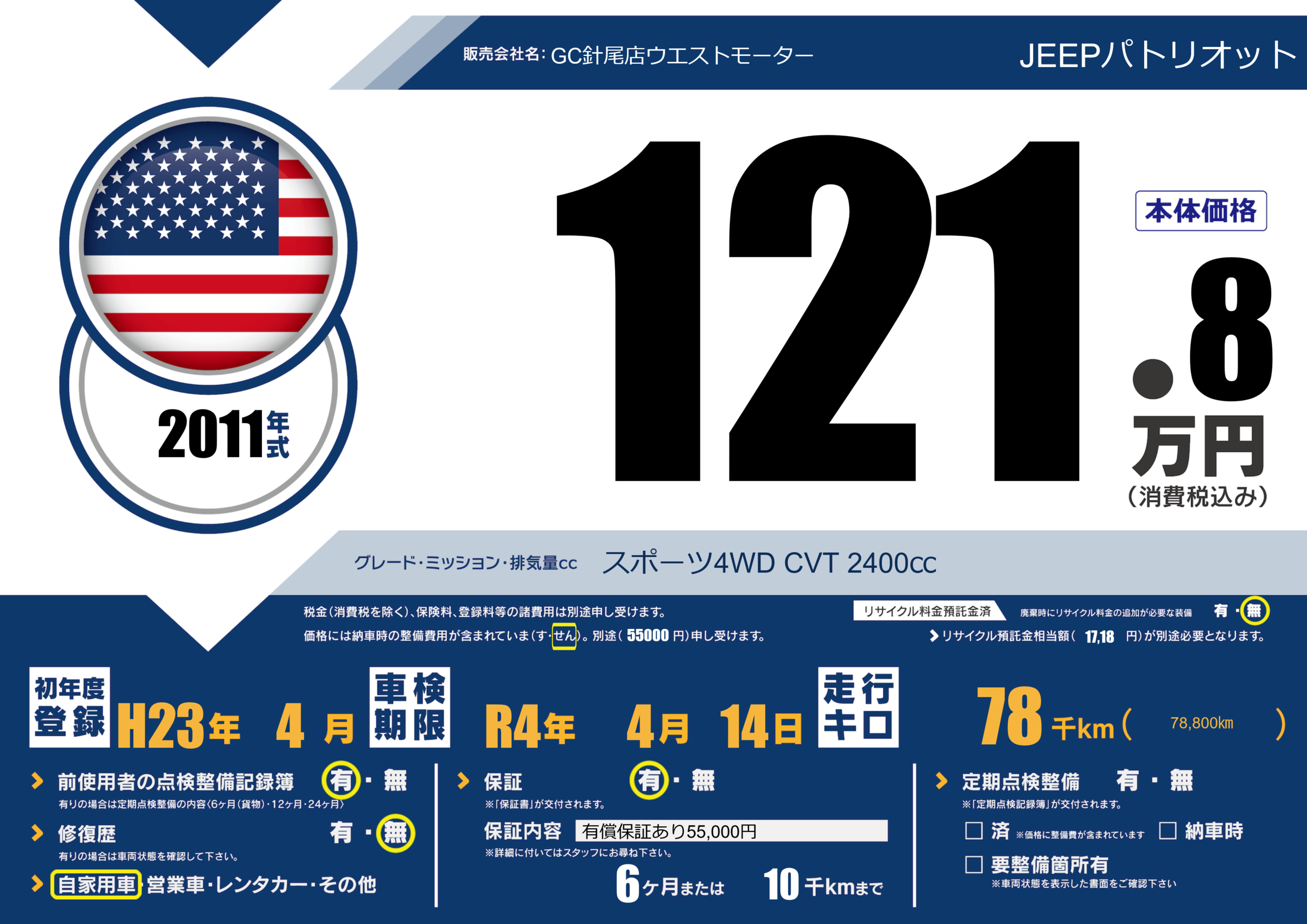 | 車名 | JEEPパトリオット | グレード ミッション 排気量 |