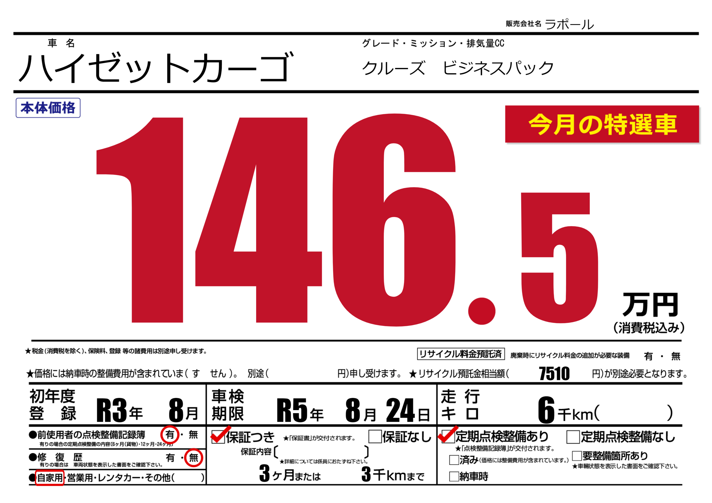 保証付き 保証内容(---) 3ヶ月または(3)千kmまで |