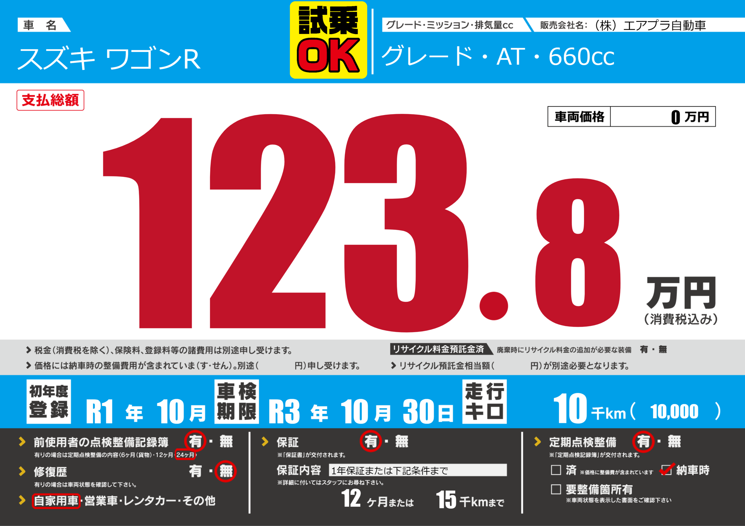 | 定期点検整備 | 定期点検整備あり 納車時あり | ||