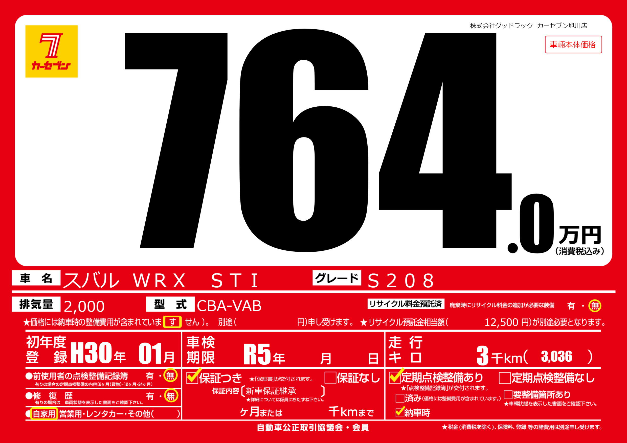 | 車名 | スバル WRX STI | グレード ミッション 排気量 |