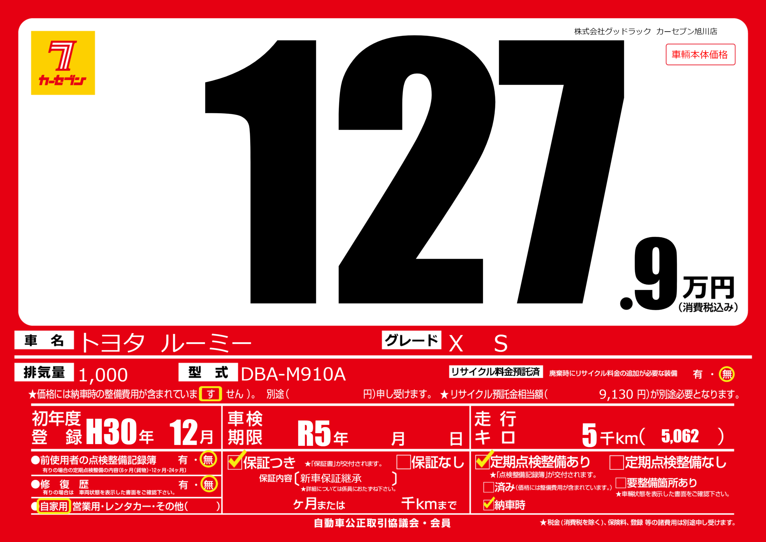 | 走行キロ | 0.5万km | 初年度登録 | H30年12月 |
