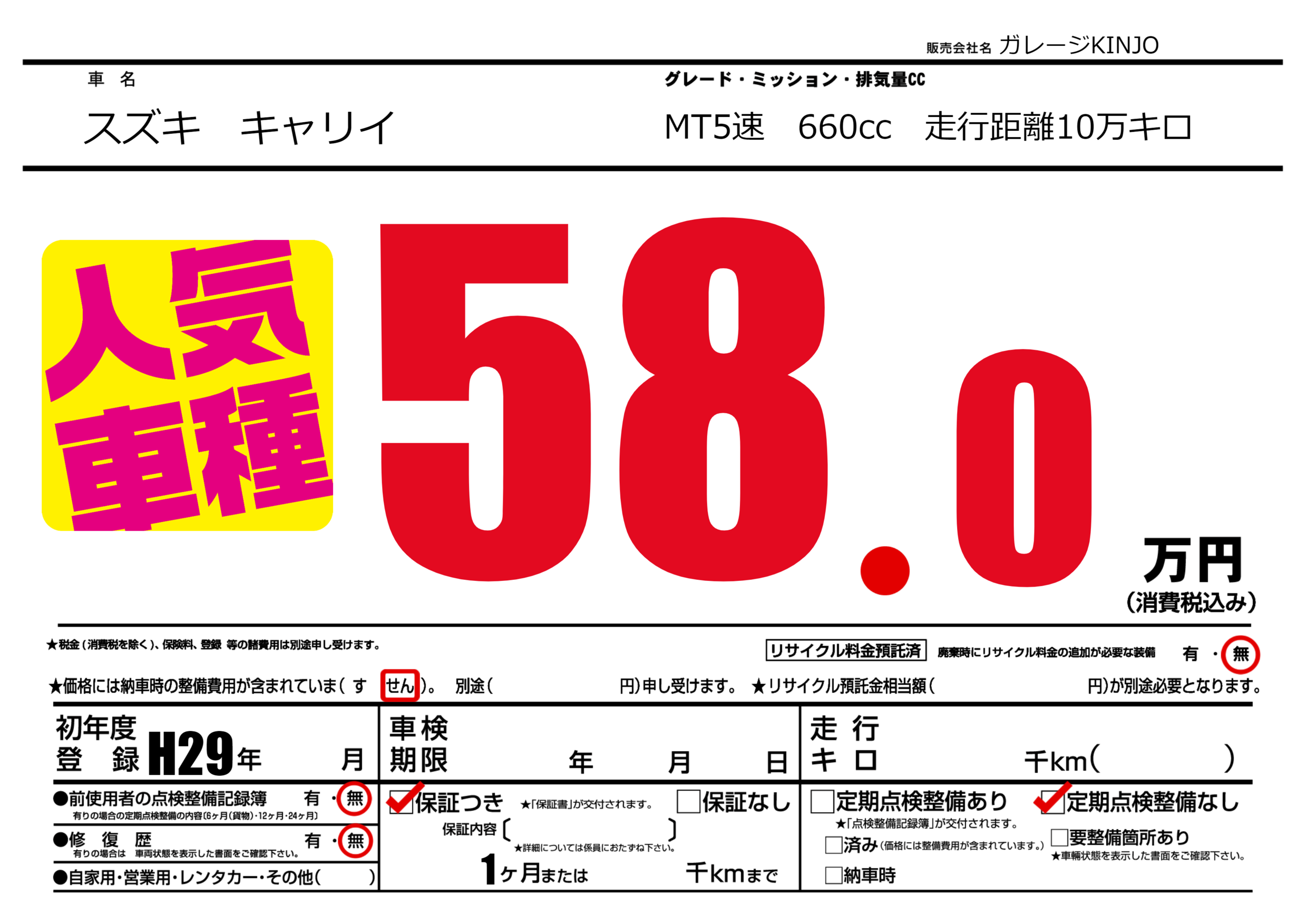保証付き 保証内容(---) 1ヶ月または()千kmまで |
