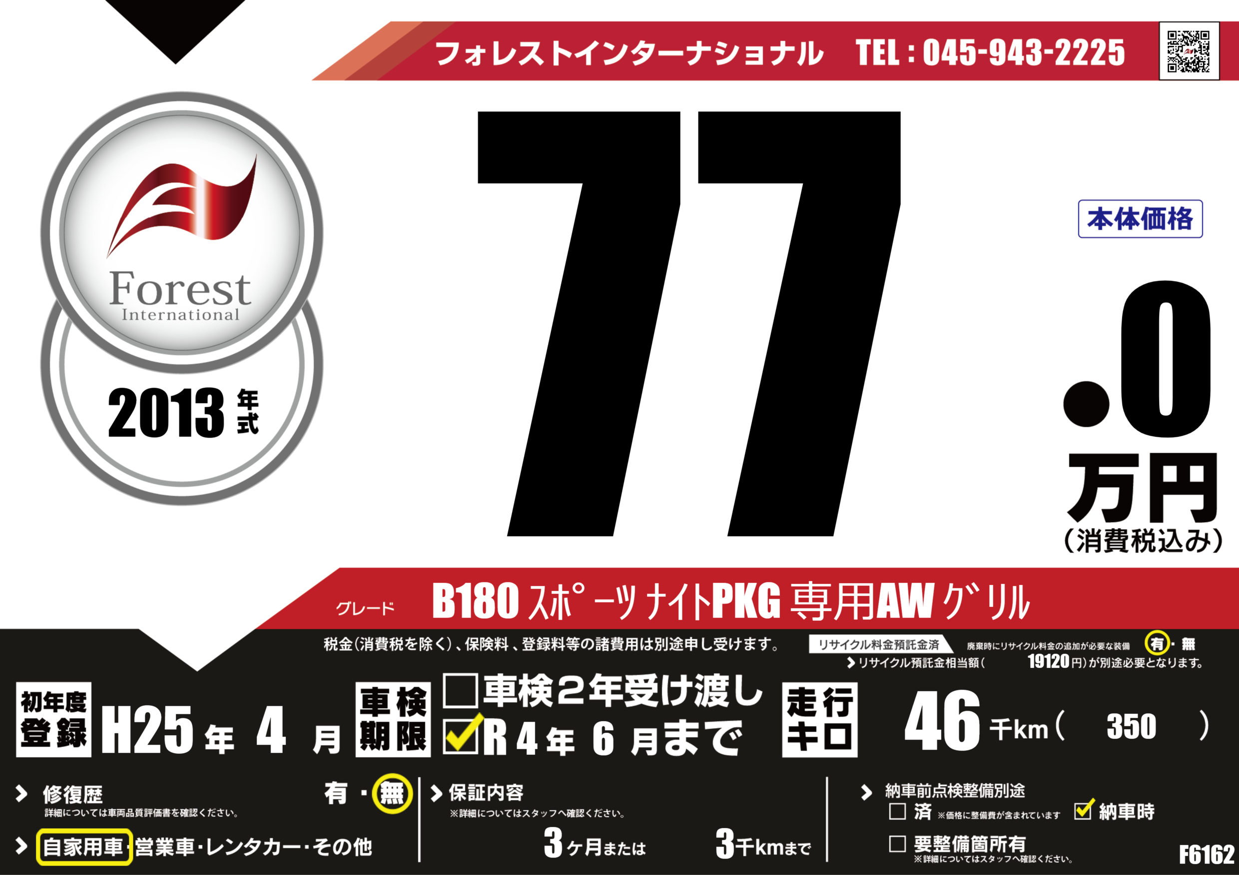 | 走行キロ | 4.6万km | 初年度登録 | H25年4月 |