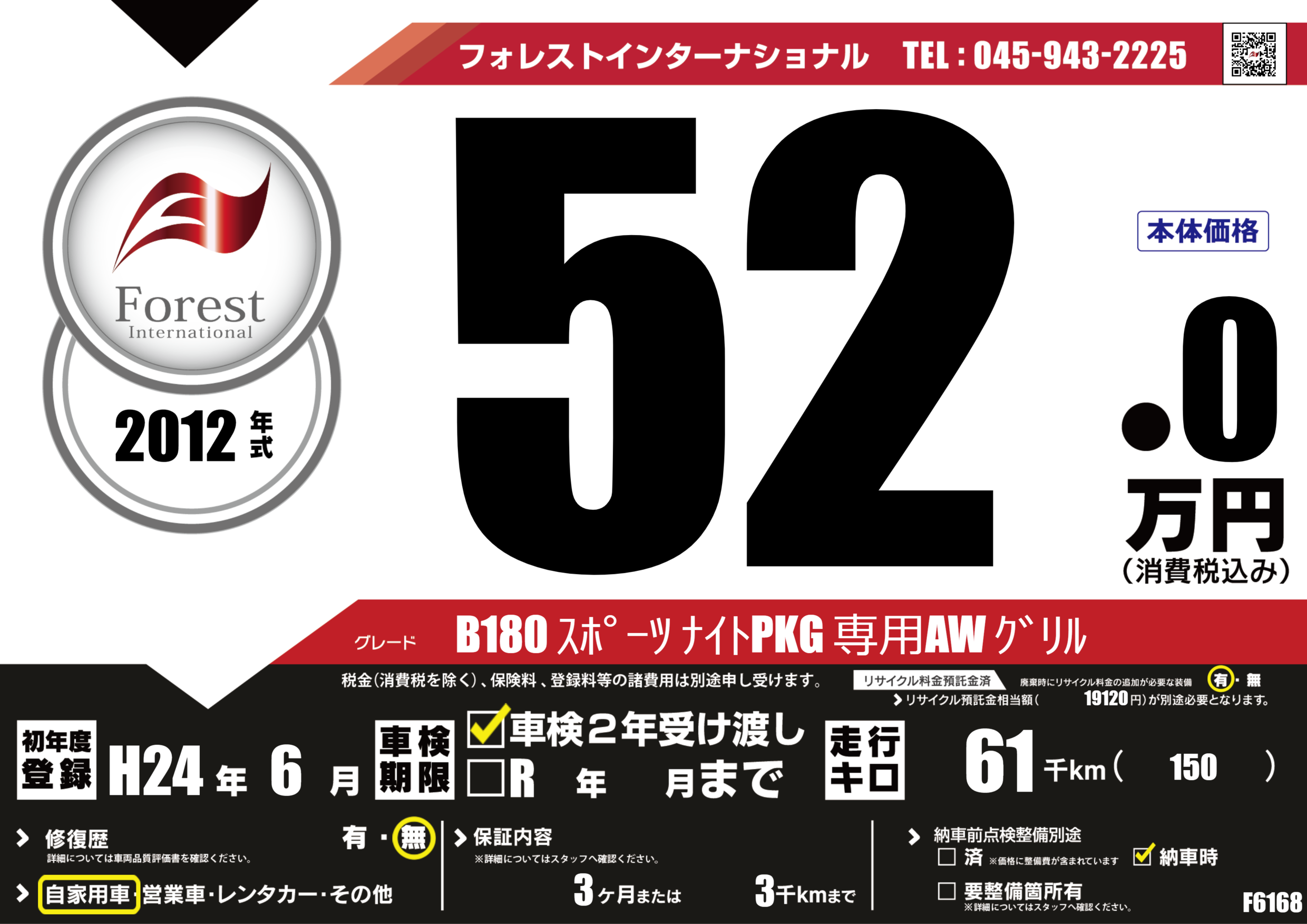| 走行キロ | 6.1万km | 初年度登録 | H24年6月 |