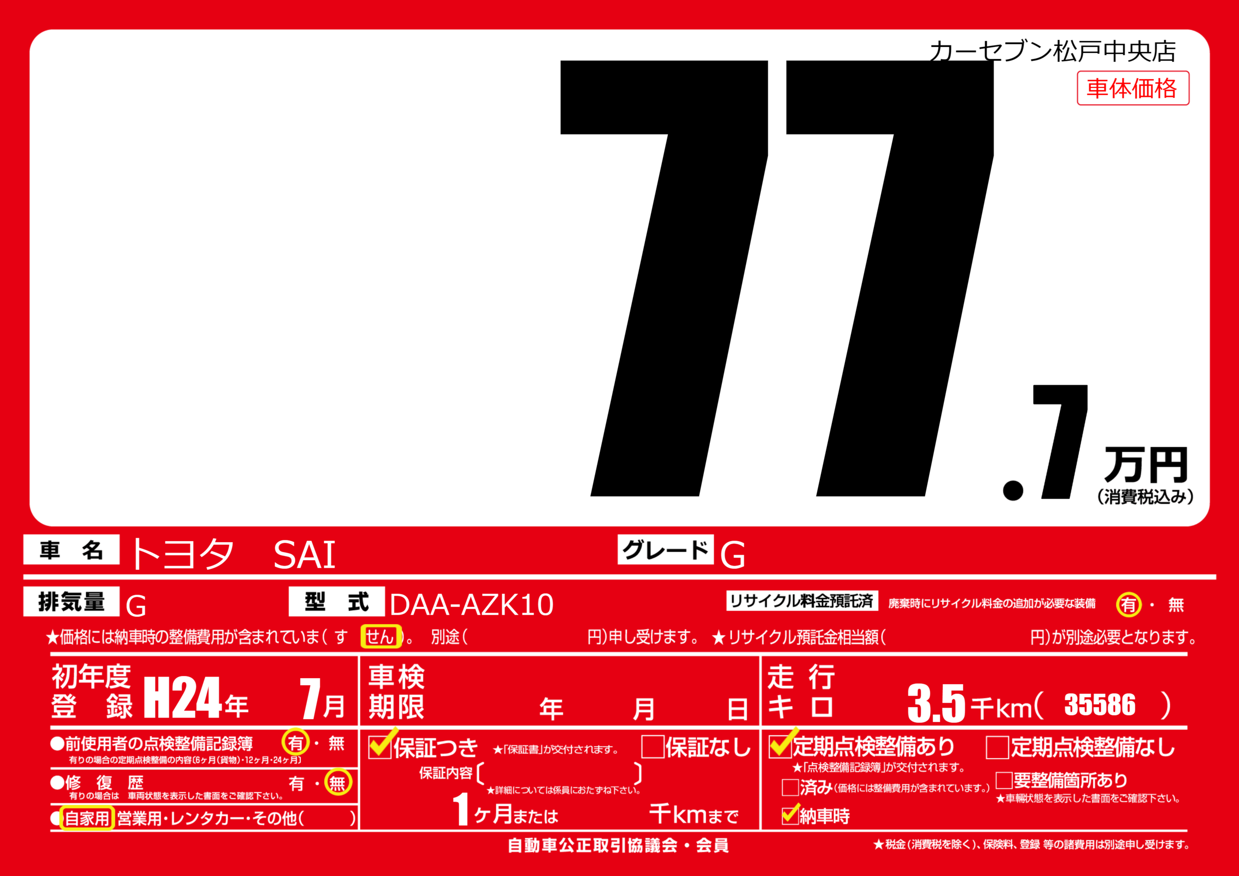 | 走行キロ | 0.3万km | 初年度登録 | H24年7月 |