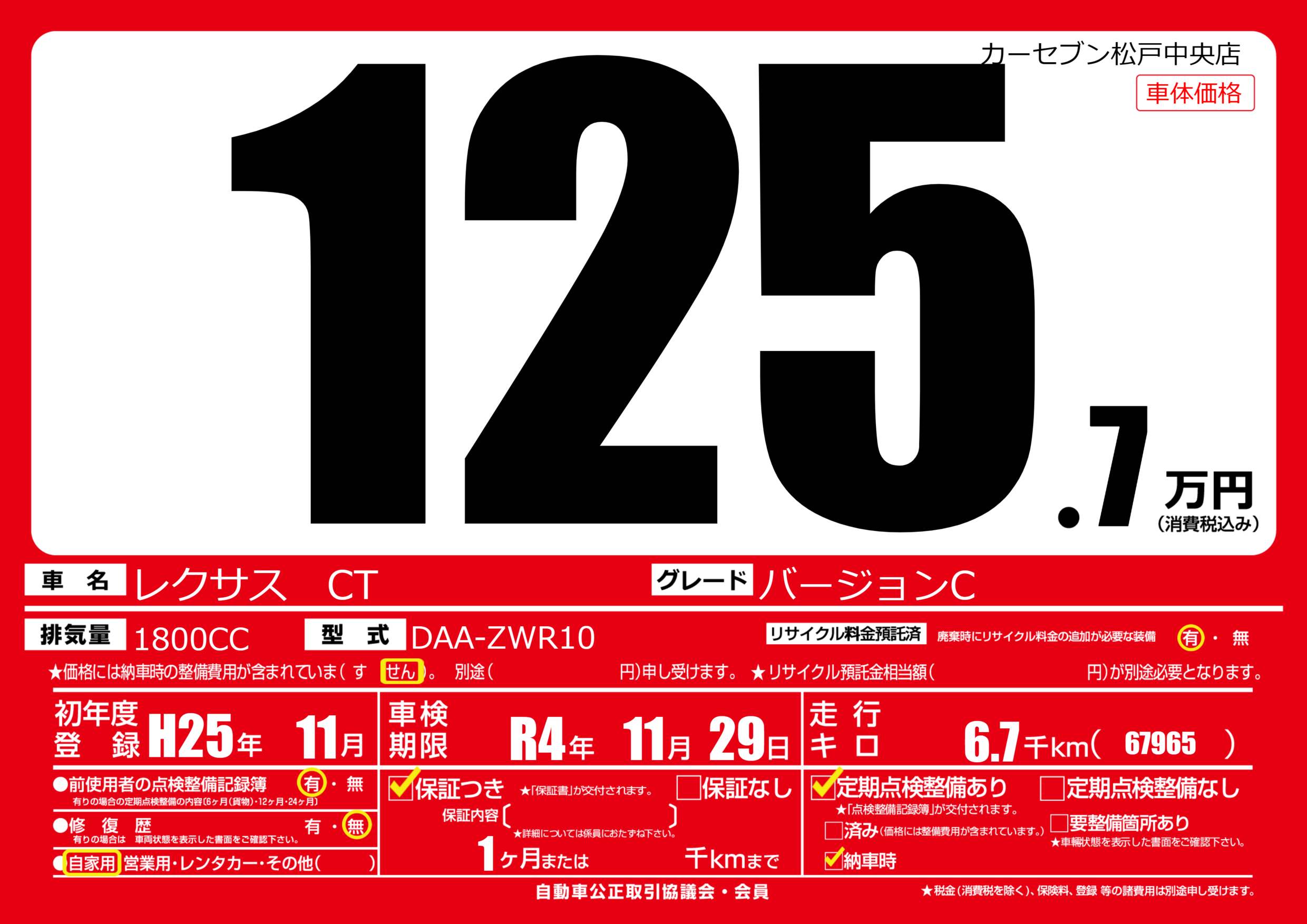 | 車名 | レクサス CT | グレード ミッション 排気量 |