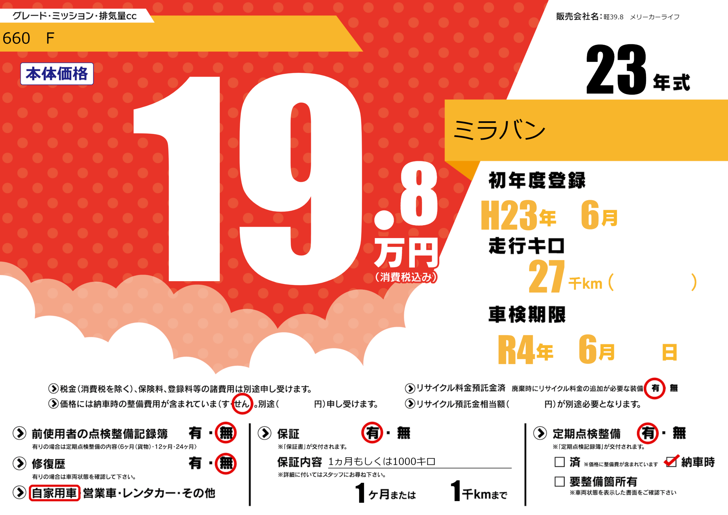 | 車名 | ミラバン | グレード ミッション 排気量 |