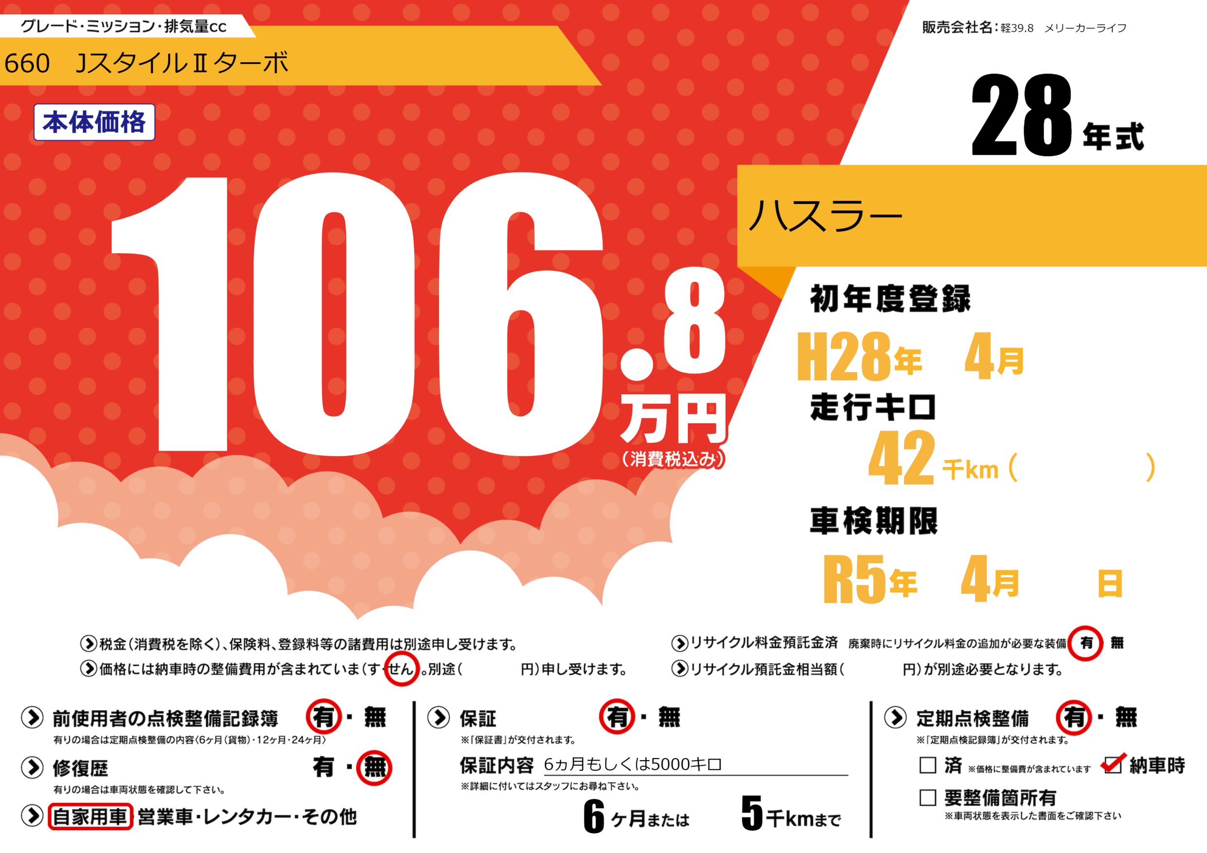 | 車名 | ハスラー | グレード ミッション 排気量 |