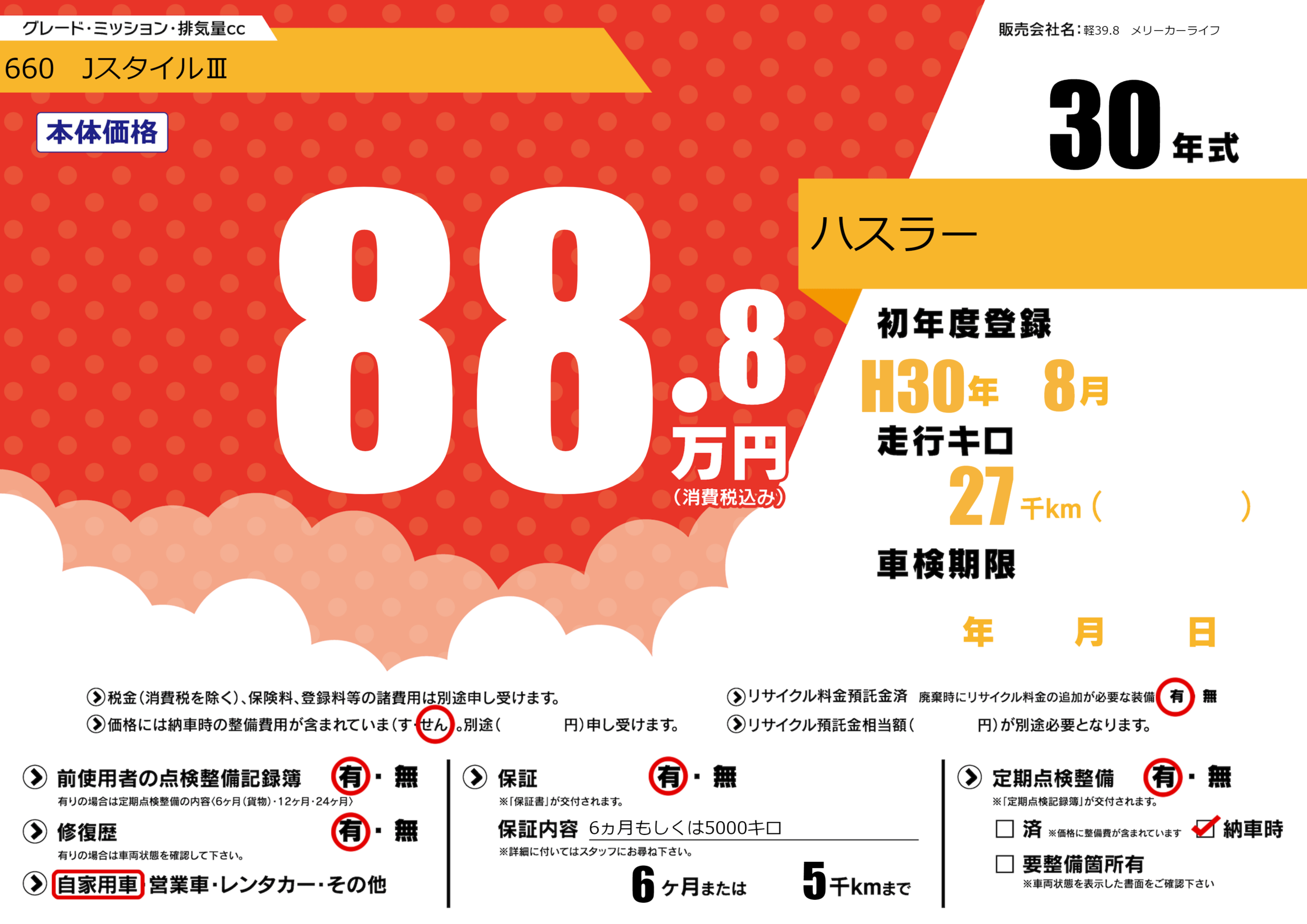 | 車名 | ハスラー | グレード ミッション 排気量 |