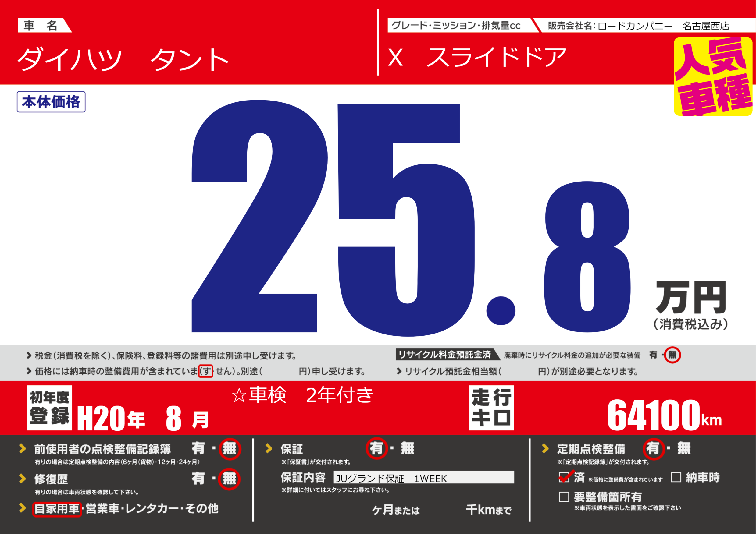 | 定期点検整備 | 定期点検整備あり 定期点検整備済み | ||