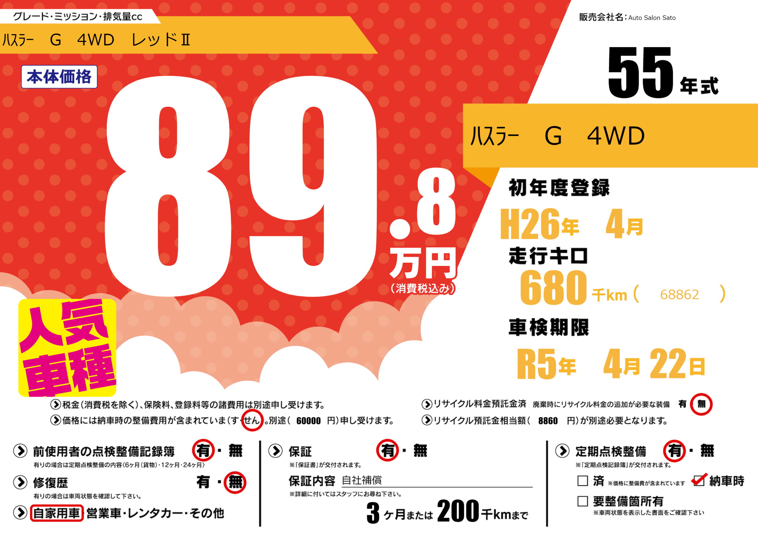 | 車名 | ハスラー G 4WD | グレード ミッション 排気量 |