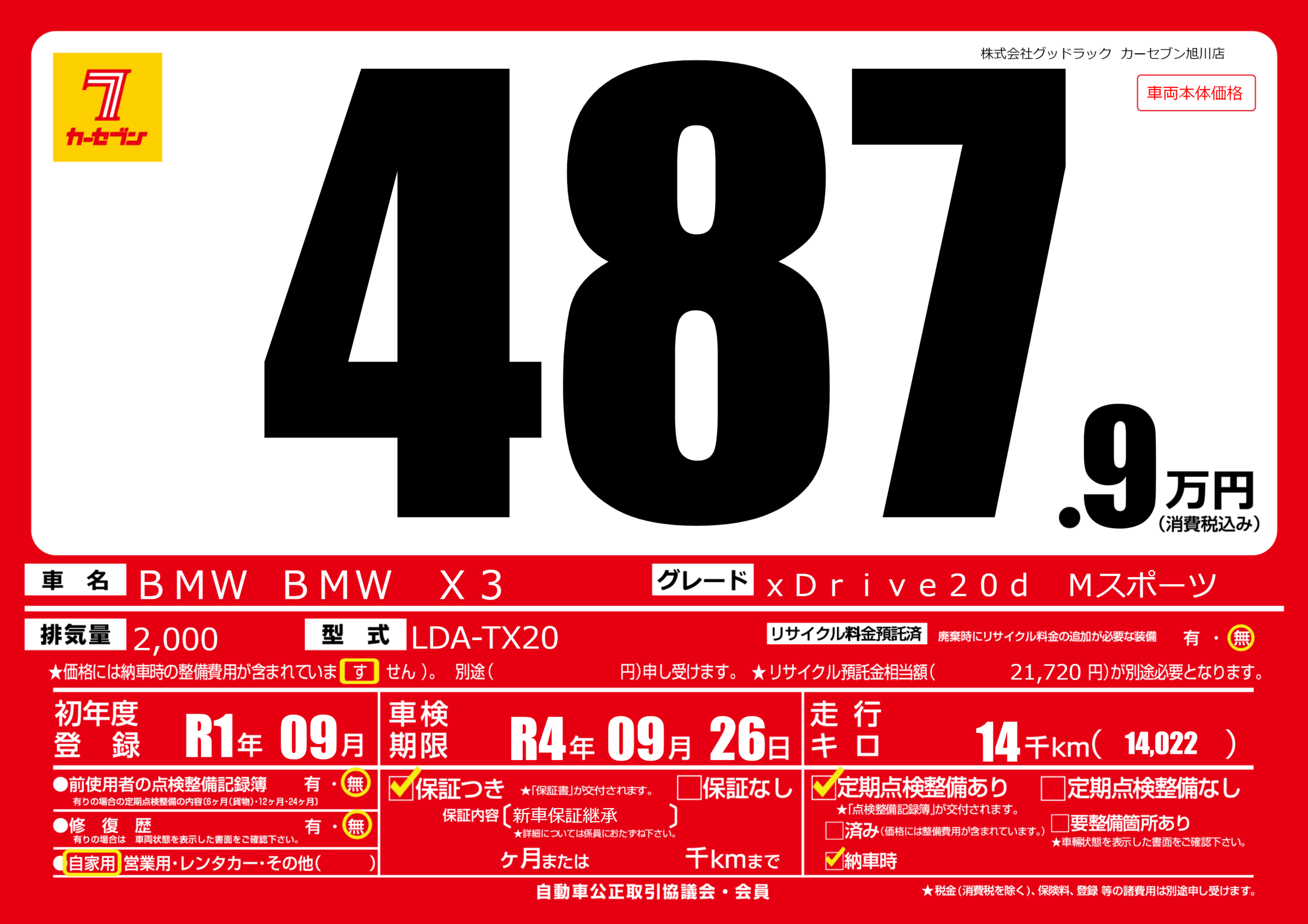 | 車名 | BMW BMW X3 | グレード ミッション 排気量 |