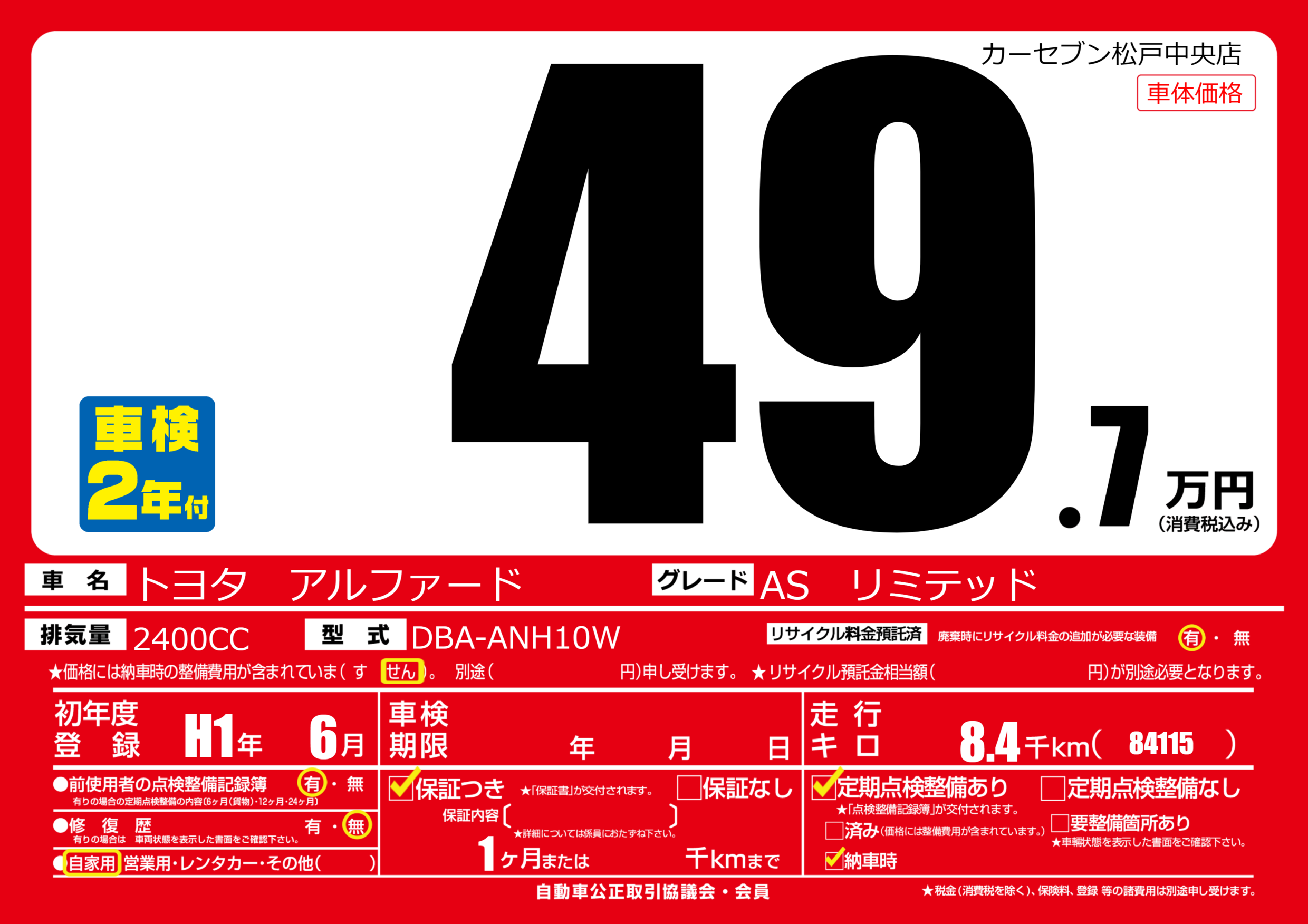 | 走行キロ | 0.8万km | 初年度登録 | H1年6月 |