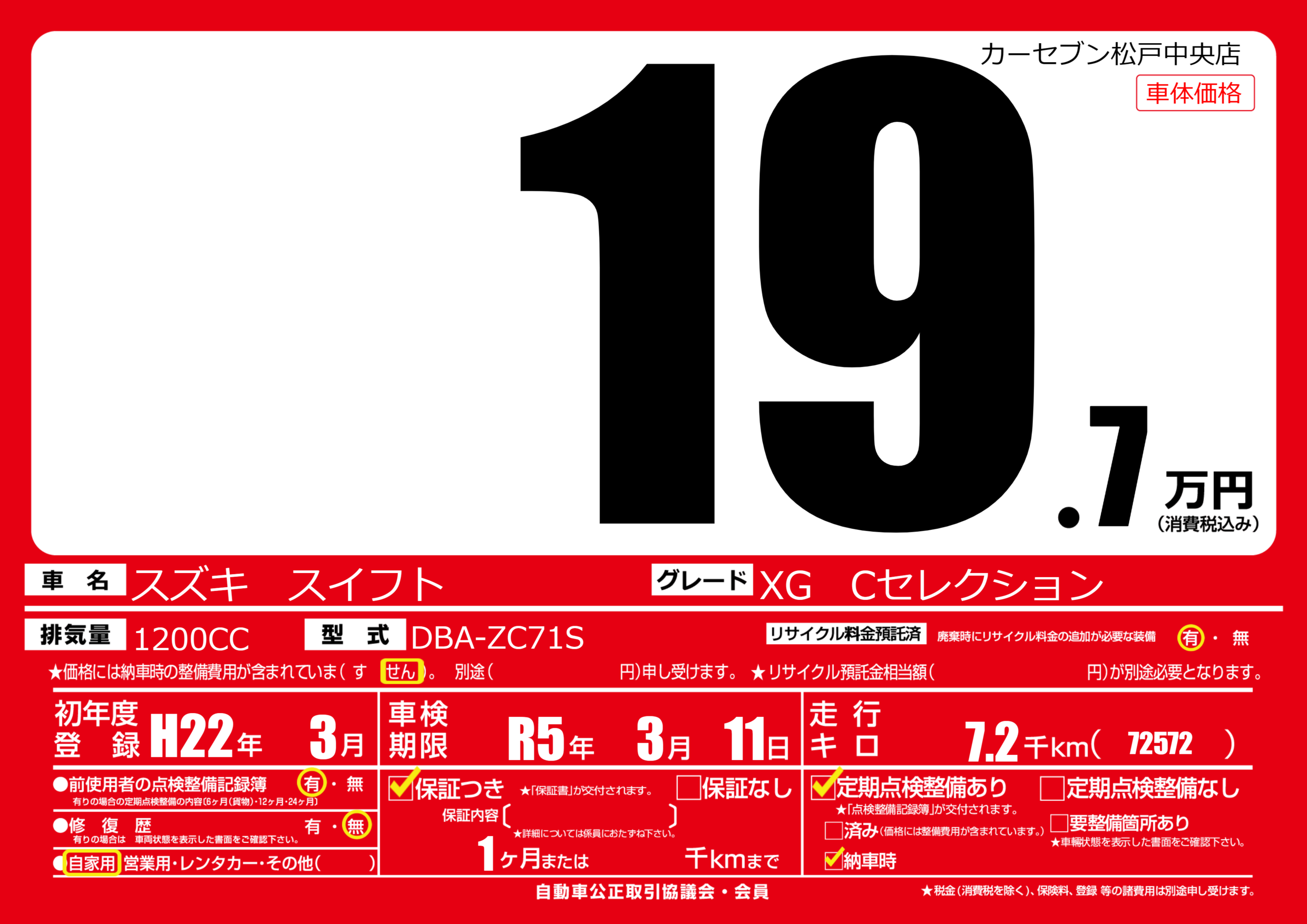 | 車名 | スズキ スイフト | グレード ミッション 排気量 |