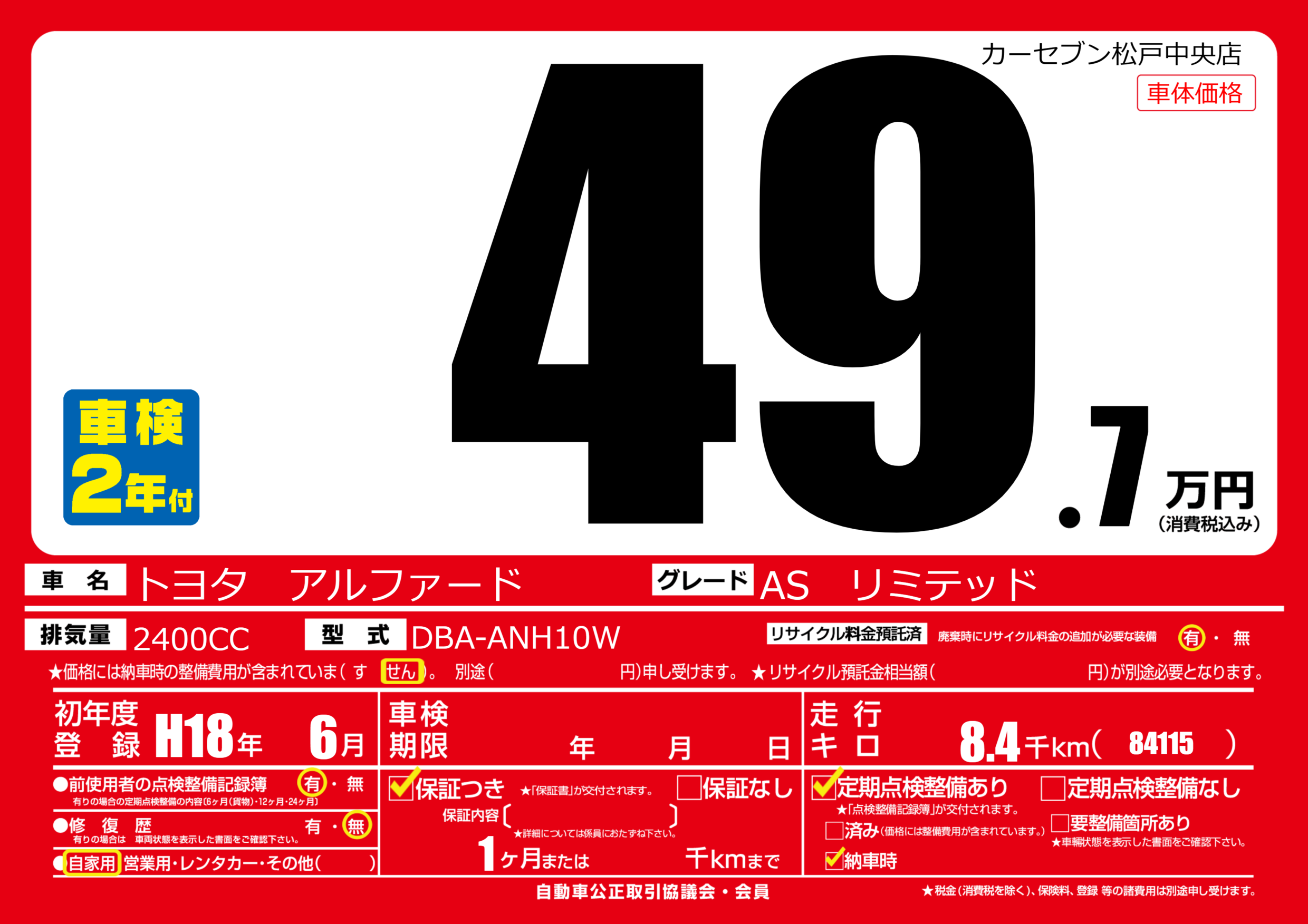 | 走行キロ | 0.8万km | 初年度登録 | H18年6月 |
