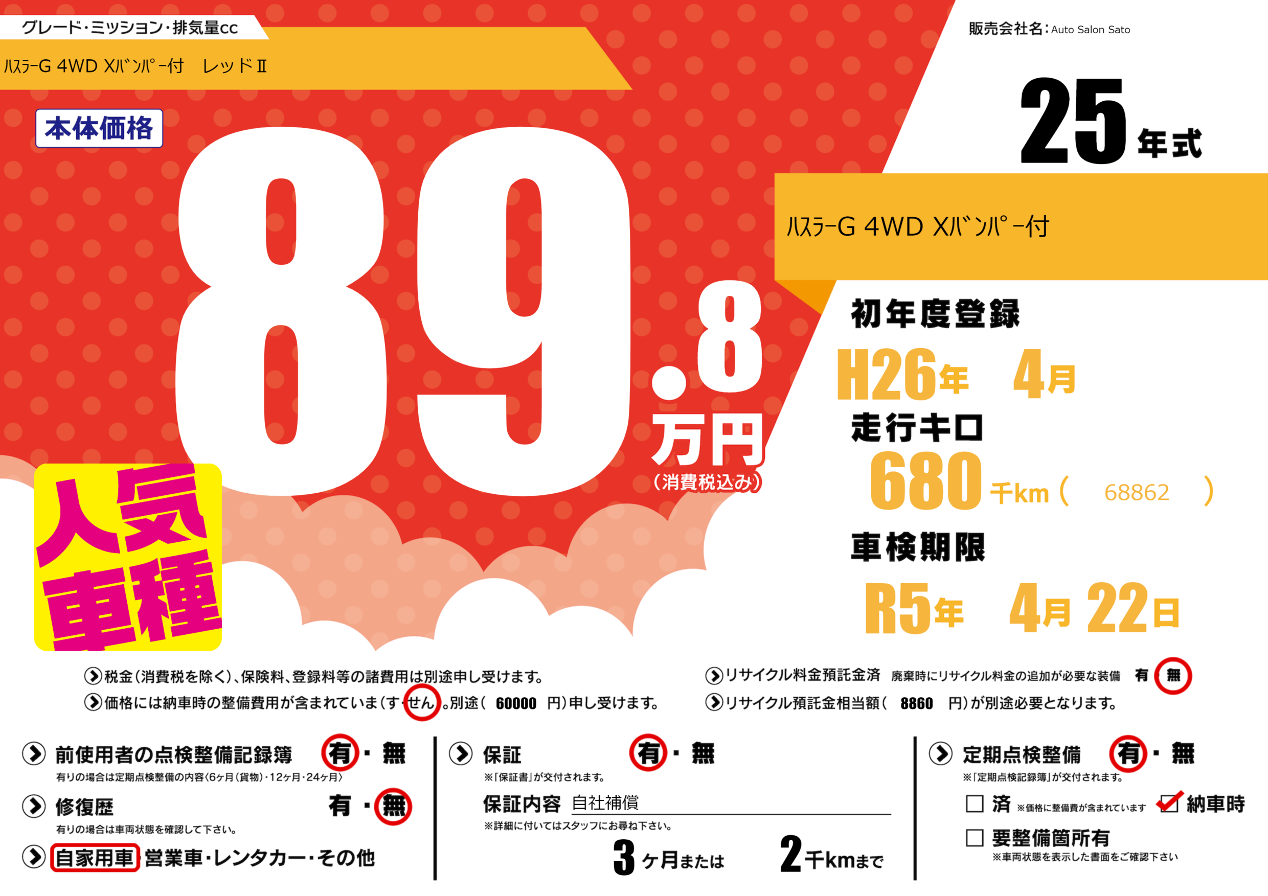 | 車名 | ハスラーG 4WD Xバンパー付 | グレード ミッション 排気量 |