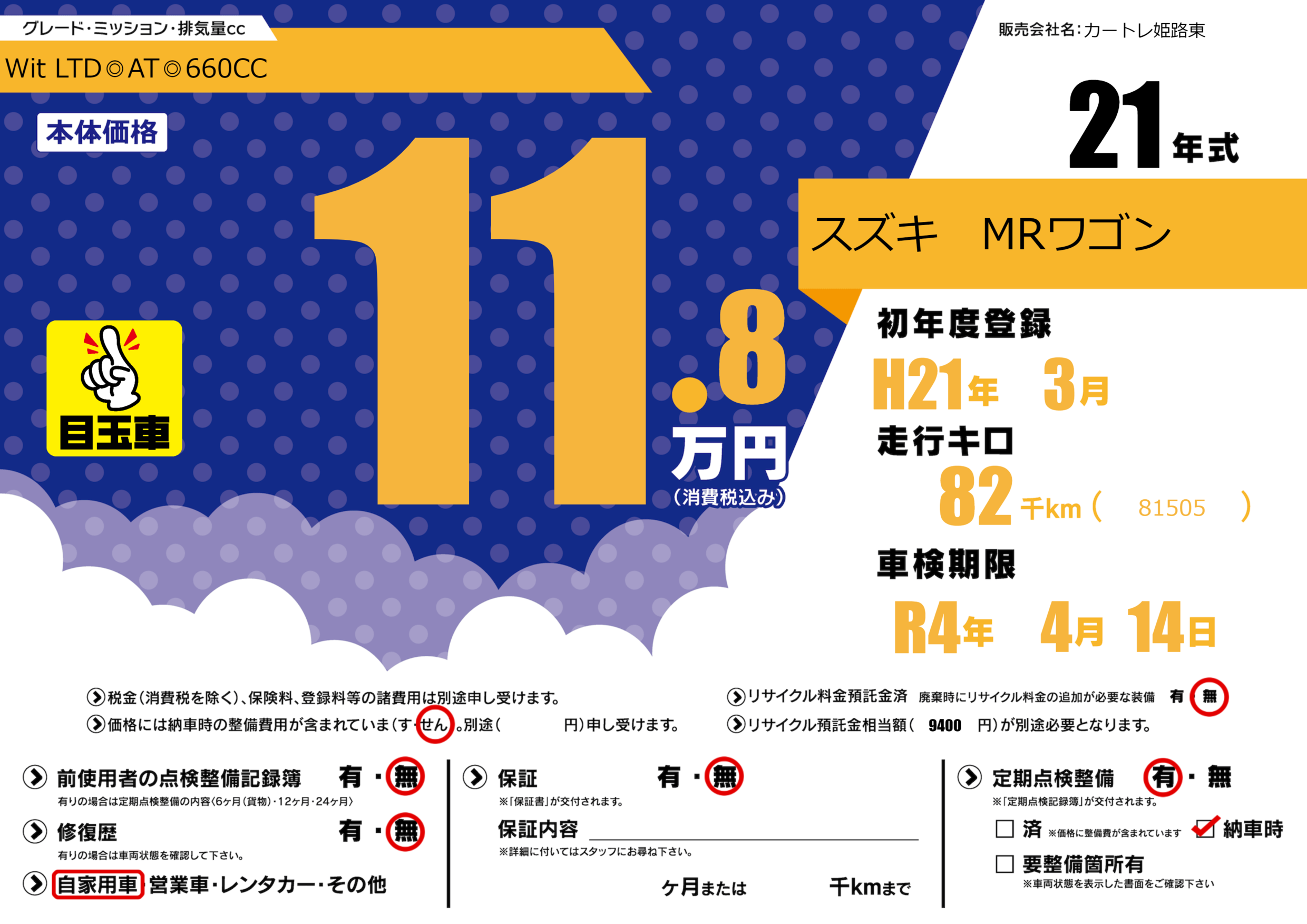 | 車名 | スズキ MRワゴン | グレード ミッション 排気量 |