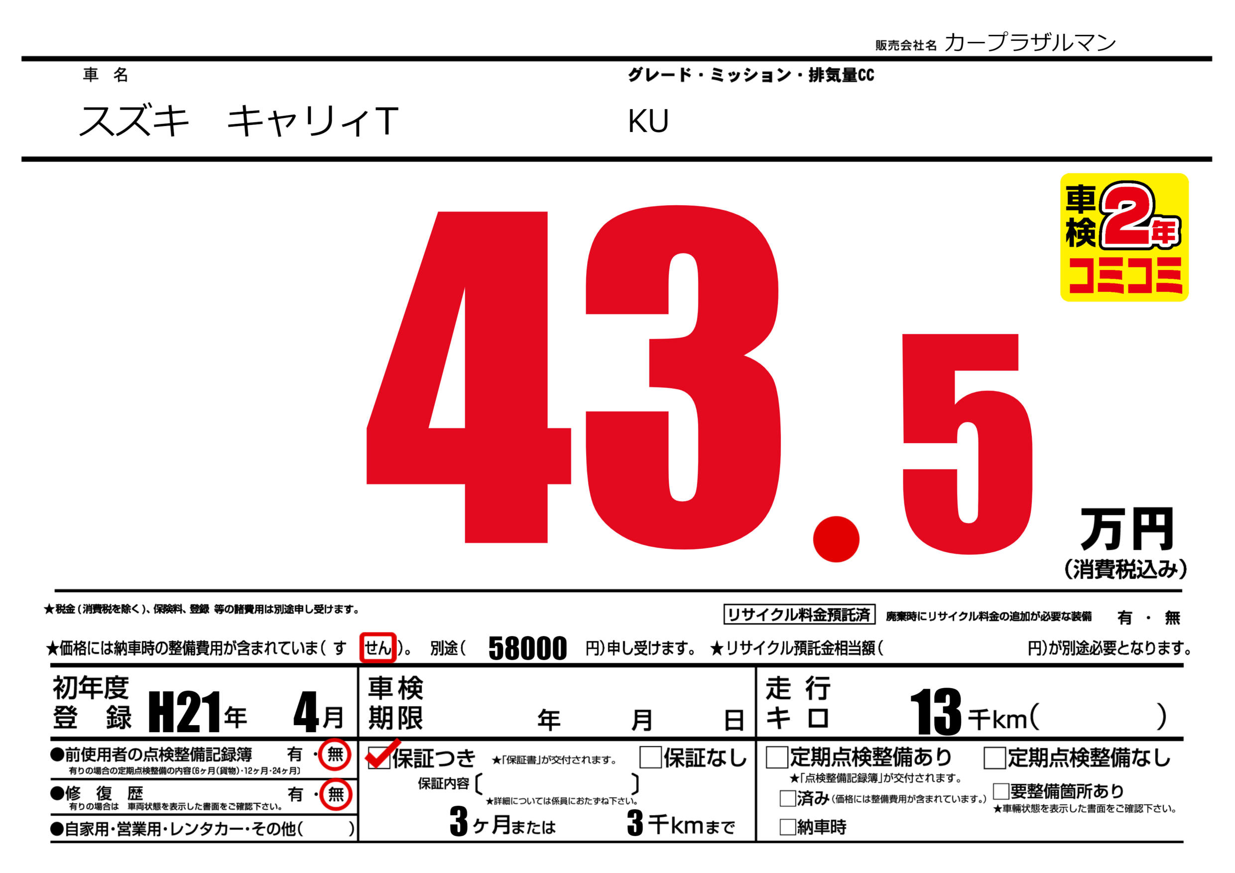 保証付き 保証内容(---) 3ヶ月または(3)千kmまで |