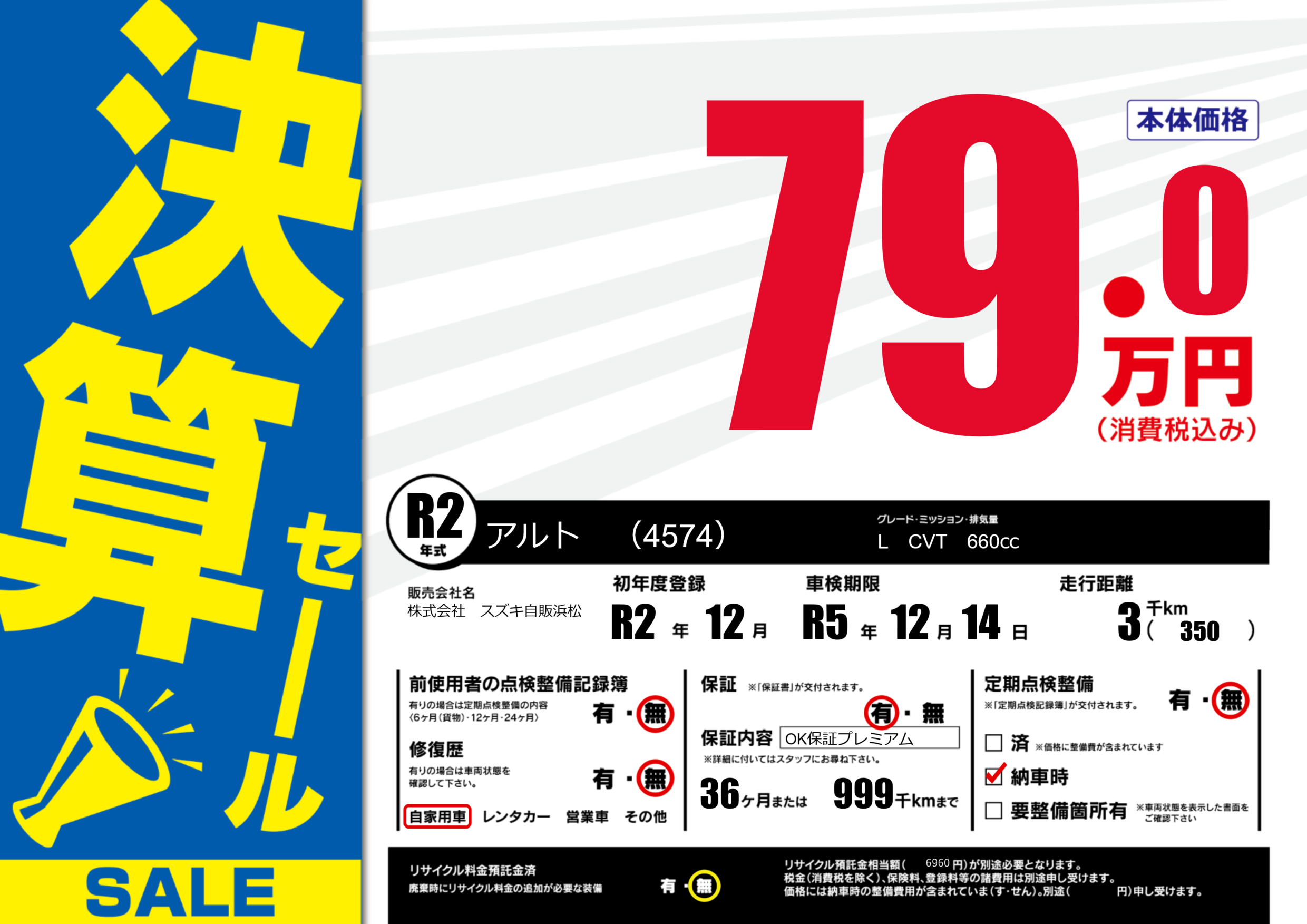 | 車名 | アルト (4574) | グレード ミッション 排気量 |