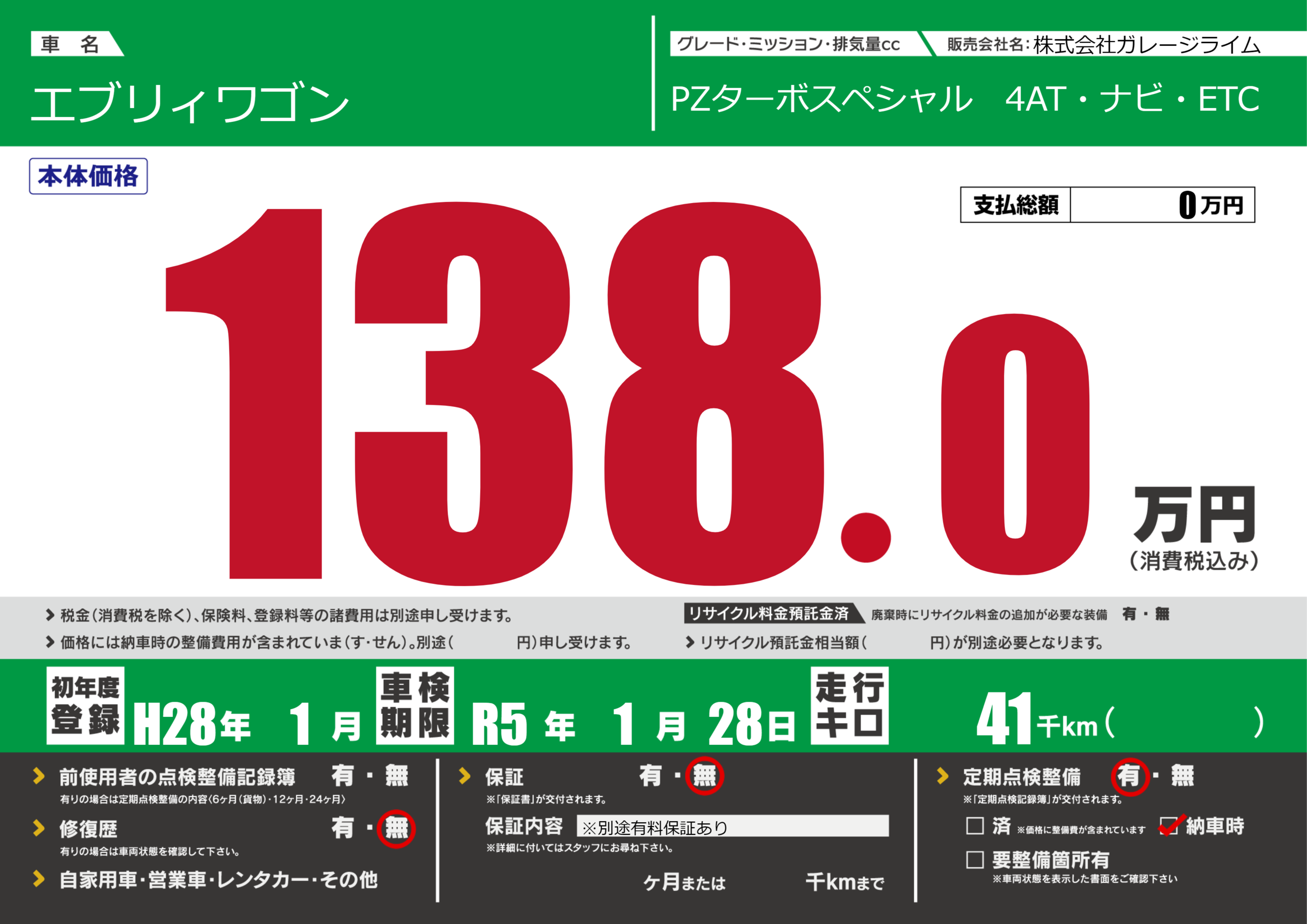 | 車名 | エブリィワゴン | グレード ミッション 排気量 |