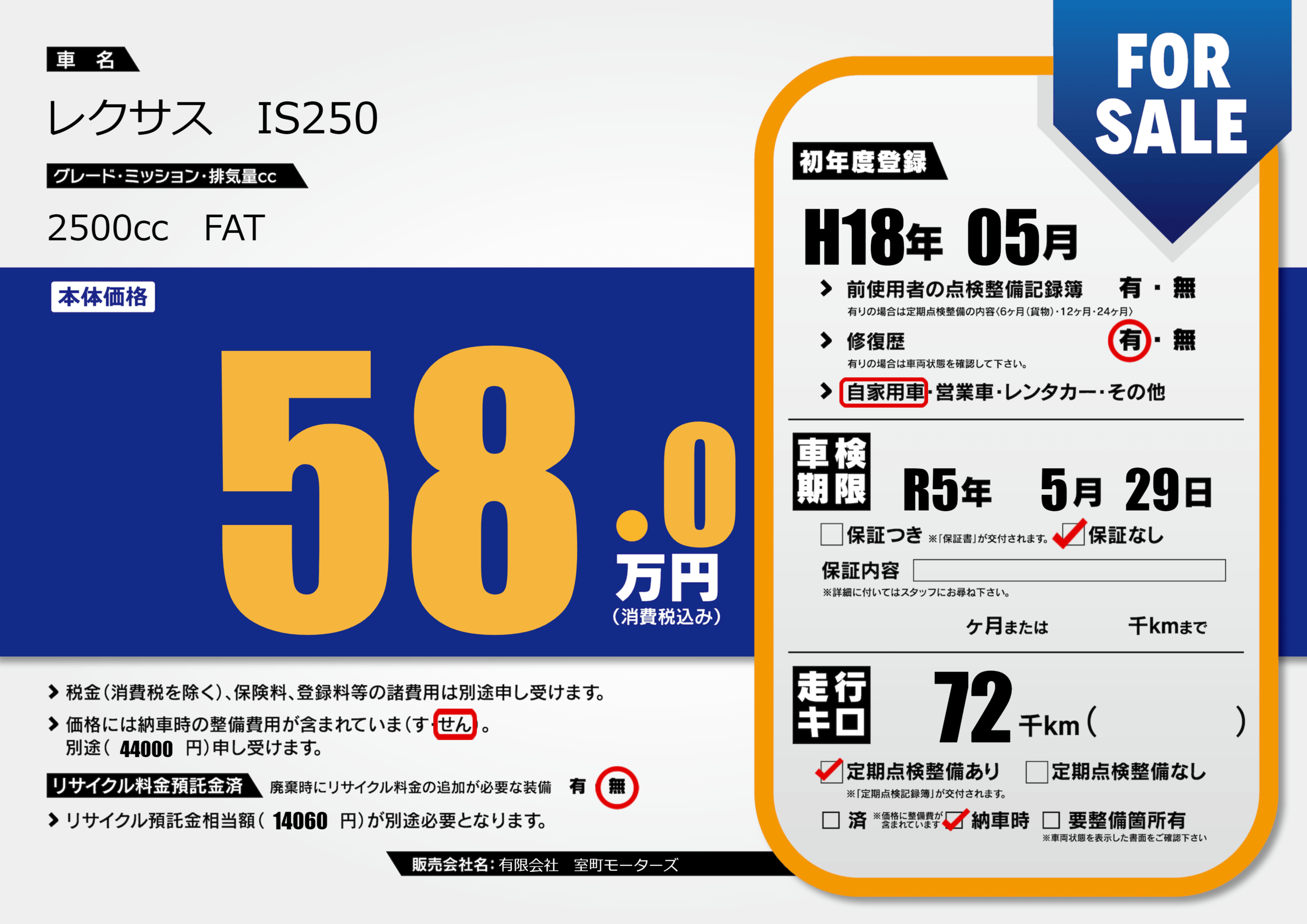 | 車名 | レクサス IS250 | グレード ミッション 排気量 |