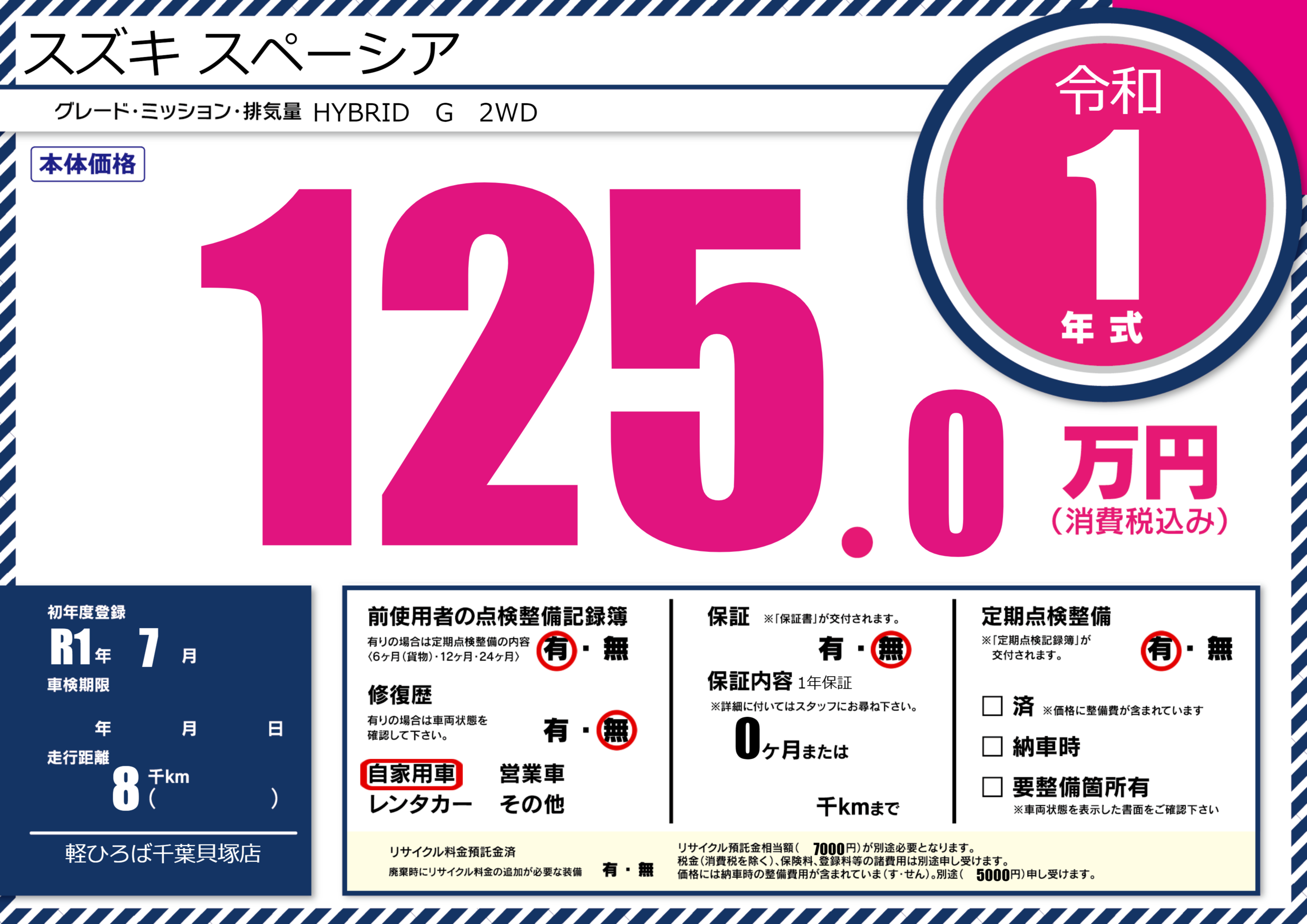 | 走行キロ | 0.8万km | 初年度登録 | R1年7月 |