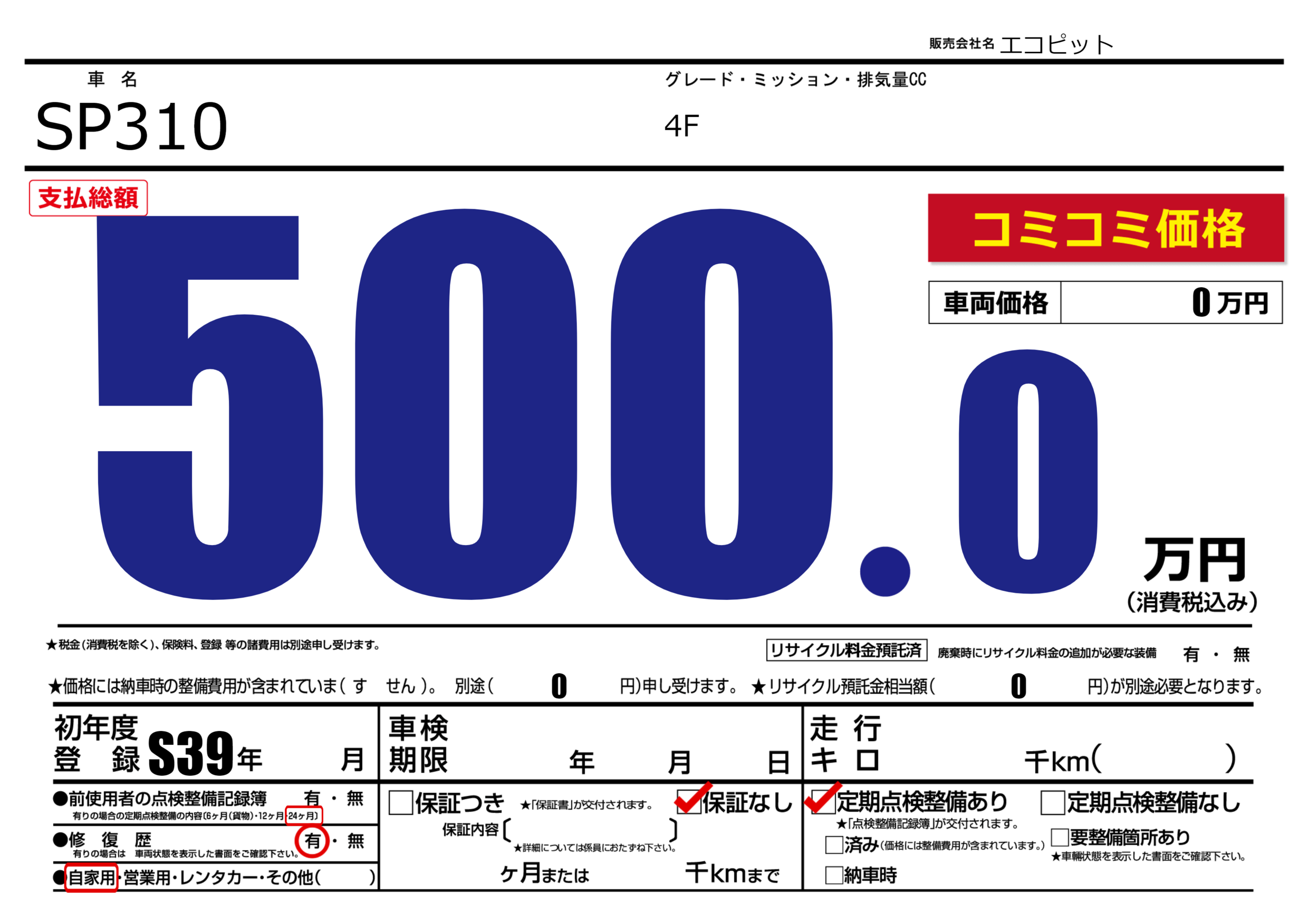 | 車名 | SP310 | グレード ミッション 排気量 |