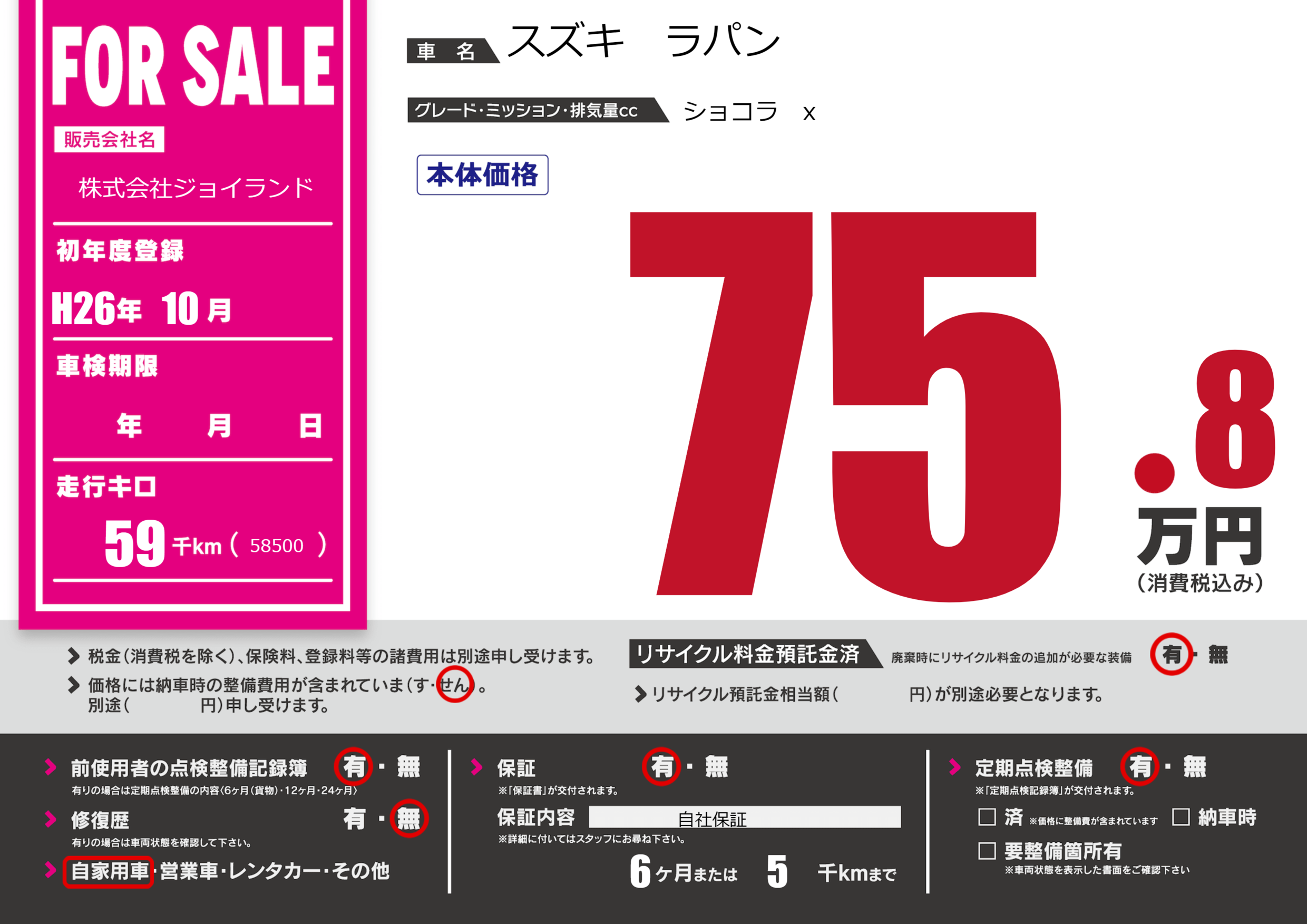 | 車名 | スズキ ラパン | グレード ミッション 排気量 |