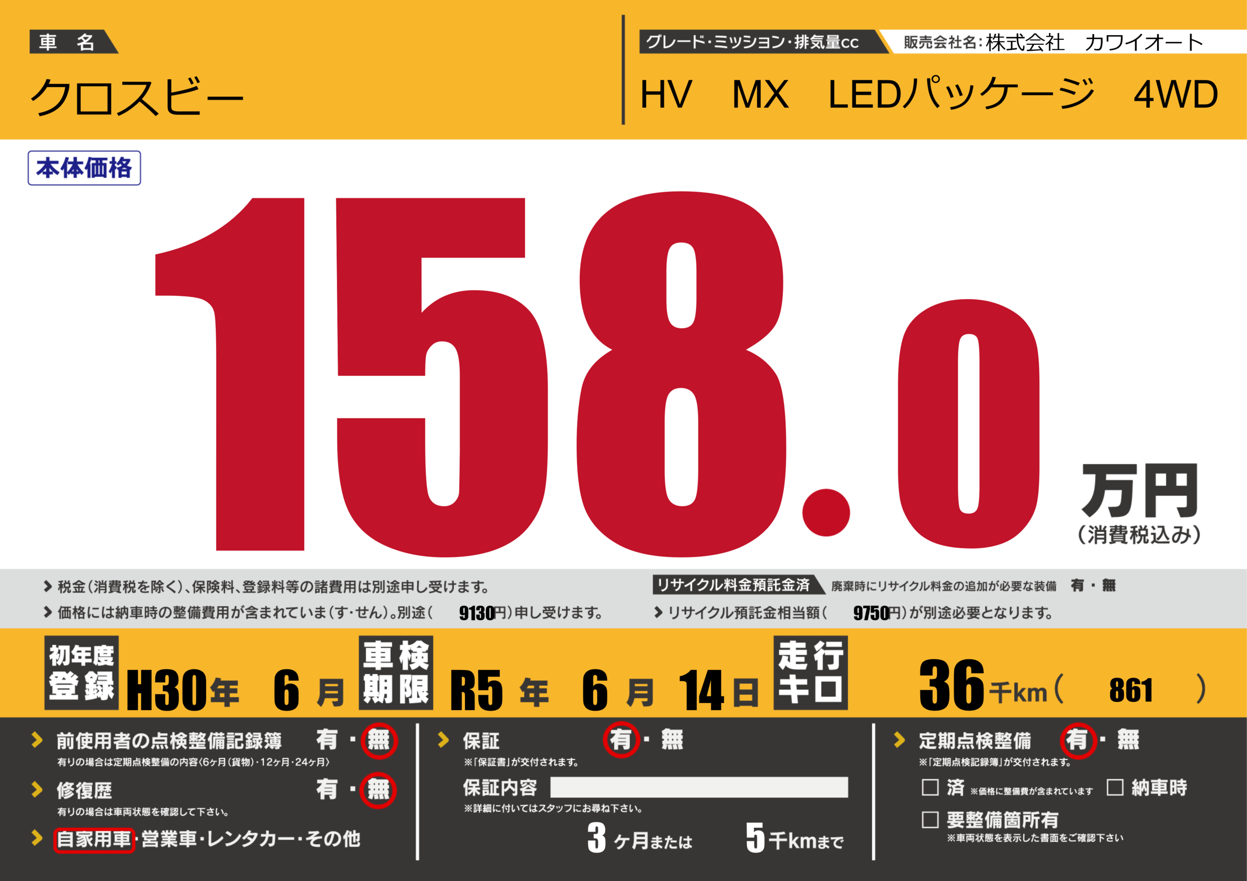 | 車名 | クロスビー | グレード ミッション 排気量 |