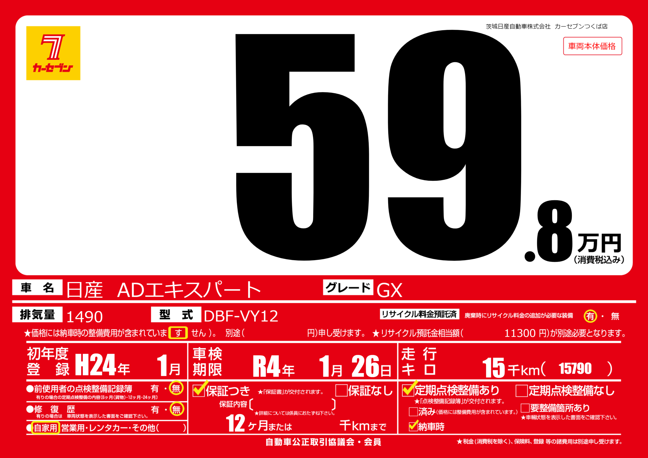 | 車名 | 日産 ADエキスパート | グレード ミッション 排気量 |