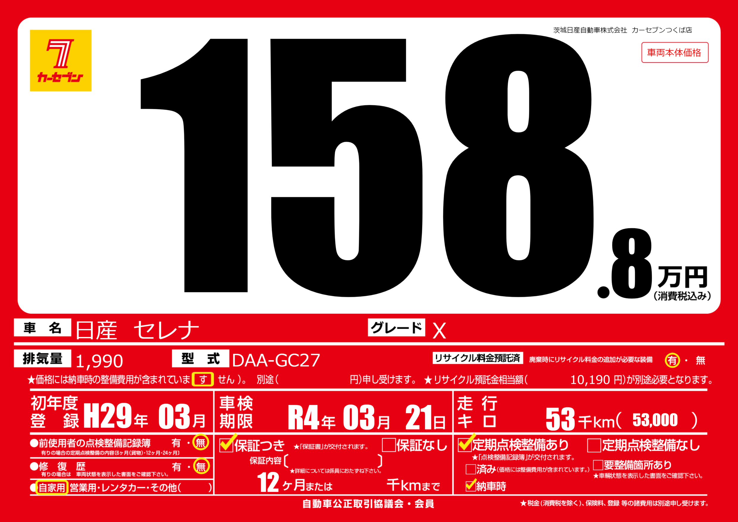| 定期点検整備 | 定期点検整備あり 納車時あり | ||