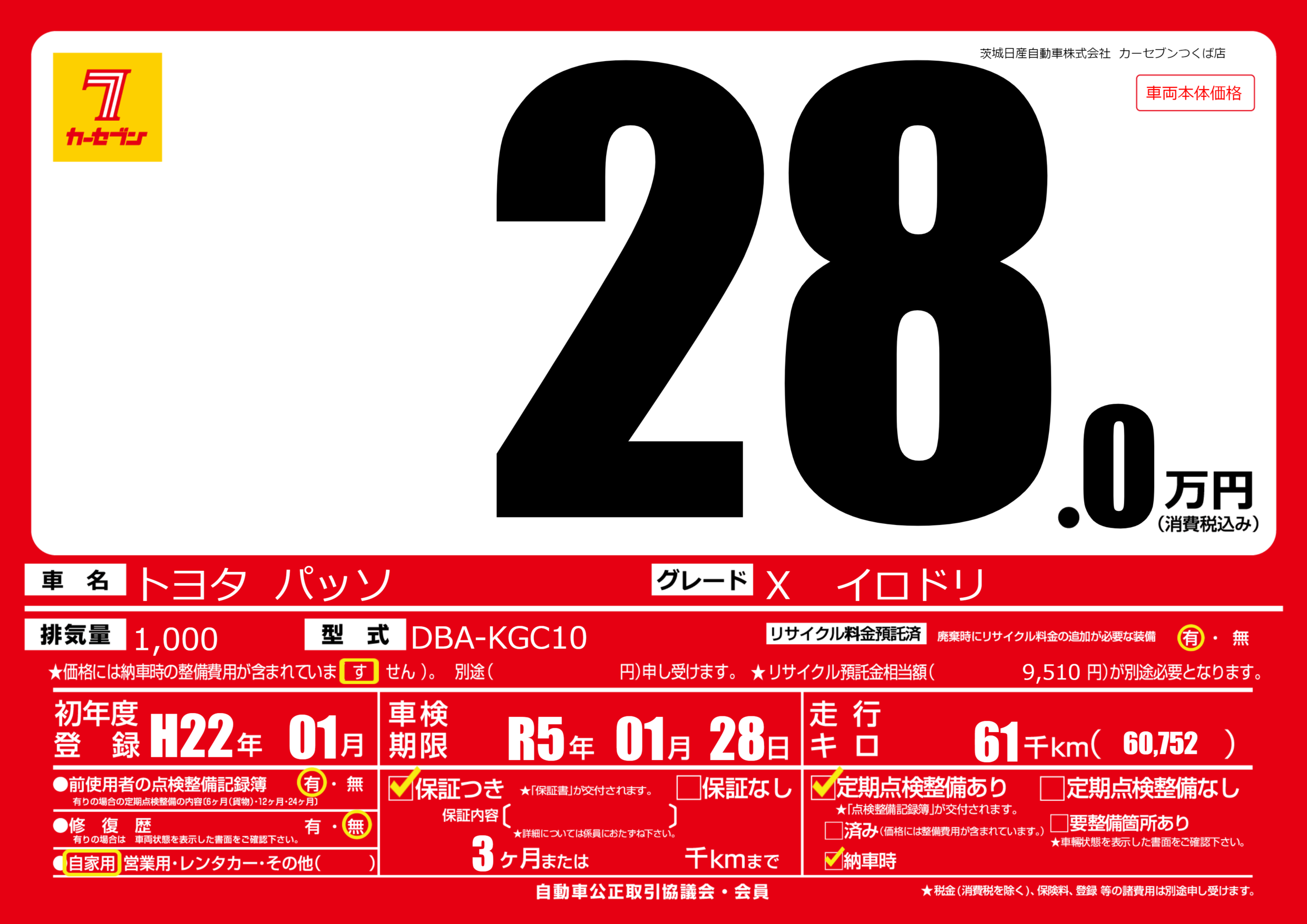 | 車名 | トヨタ パッソ | グレード ミッション 排気量 |