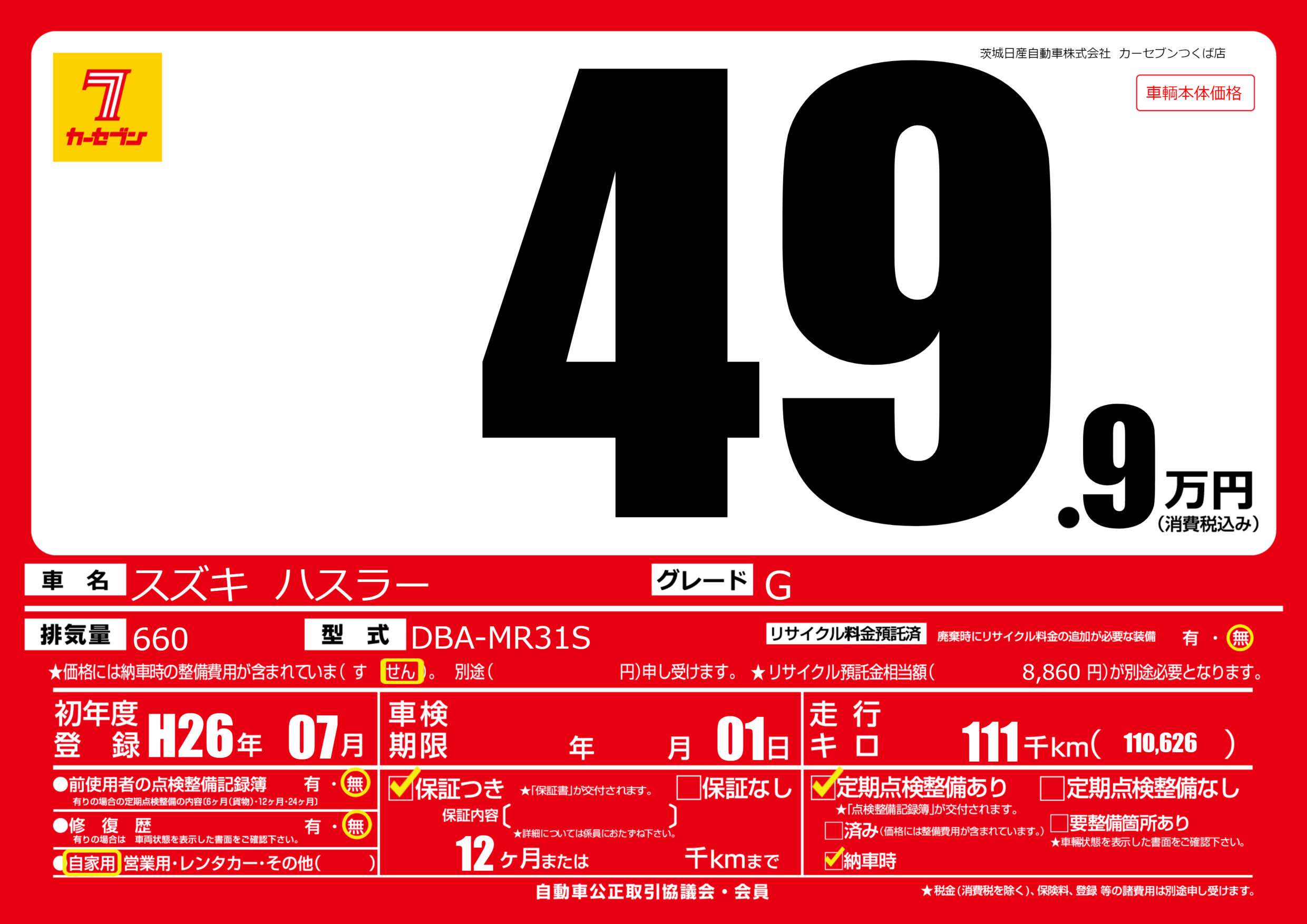 | 走行キロ | 11.1万km | 初年度登録 | H26年07月 |