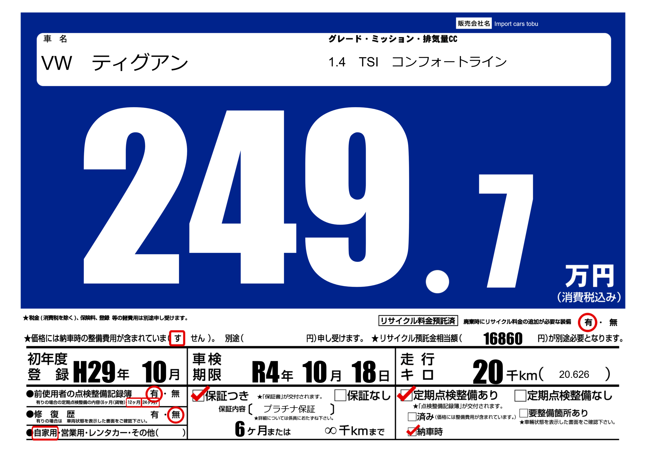 | 車名 | VW ティグアン | グレード ミッション 排気量 |