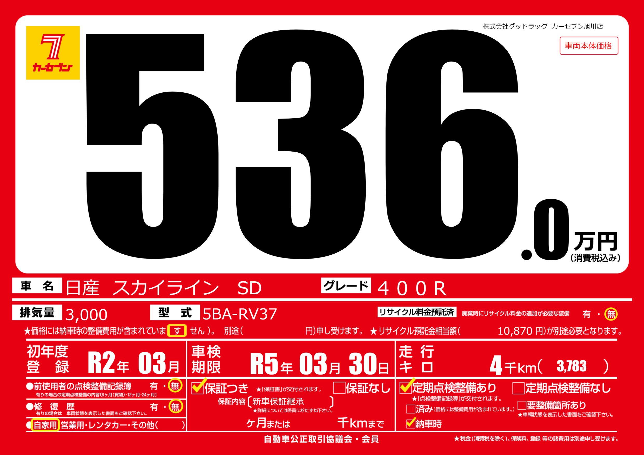 | 走行キロ | 0.4万km | 初年度登録 | R2年03月 |