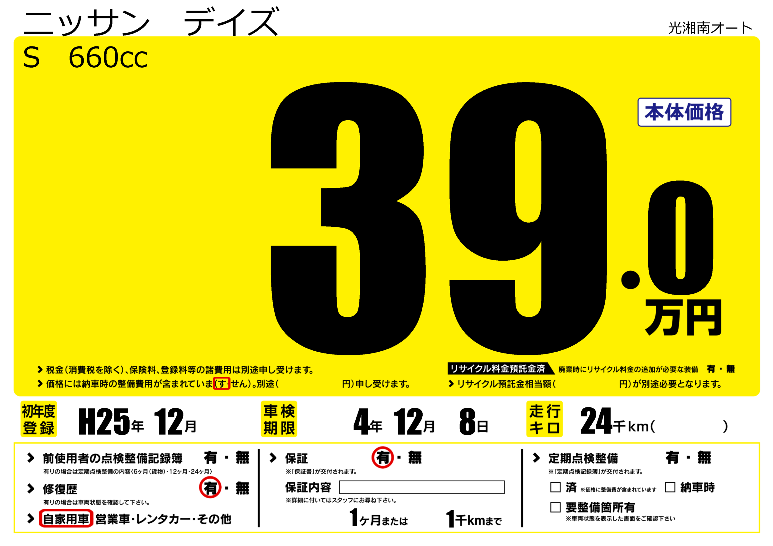 | 車名 | ニッサン デイズ | グレード ミッション 排気量 |