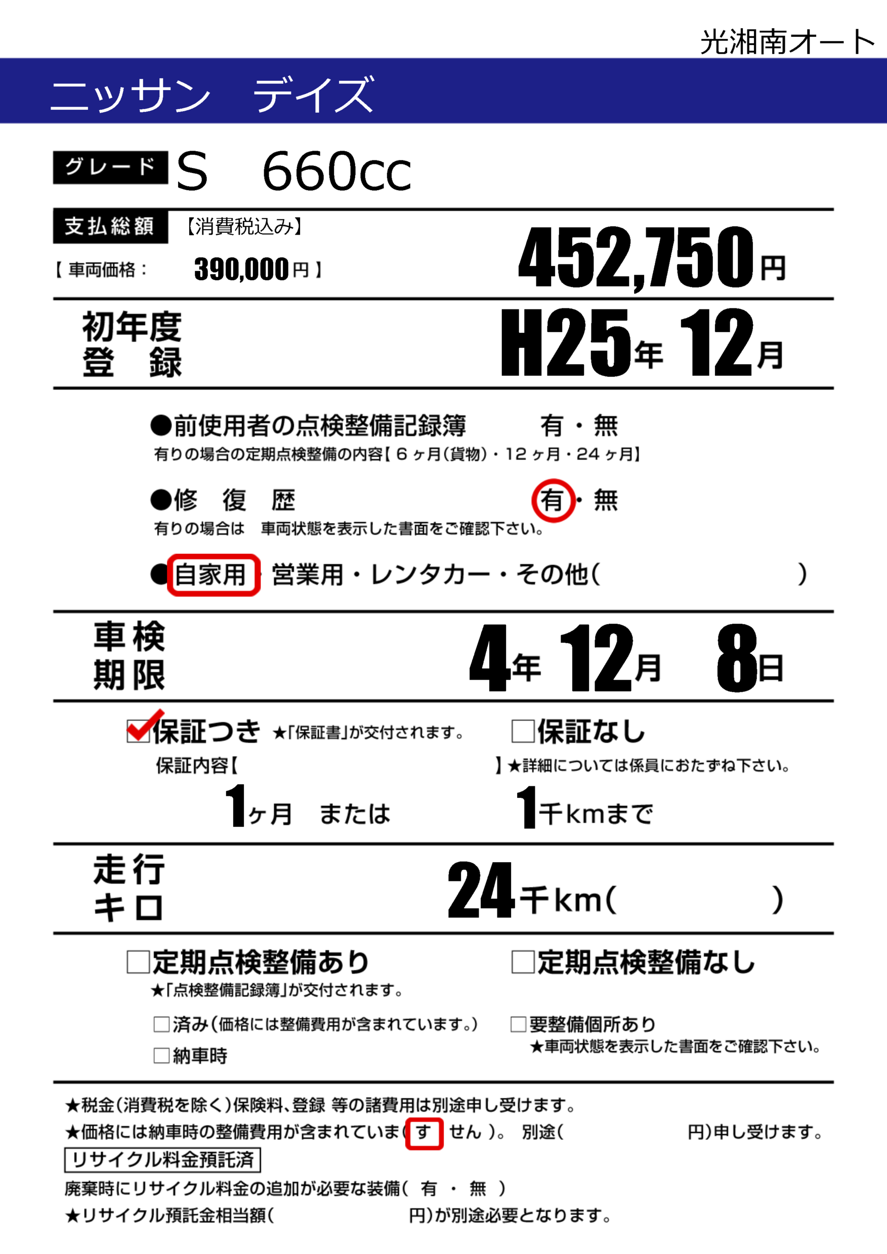| 車名 | ニッサン デイズ | グレード ミッション 排気量 |