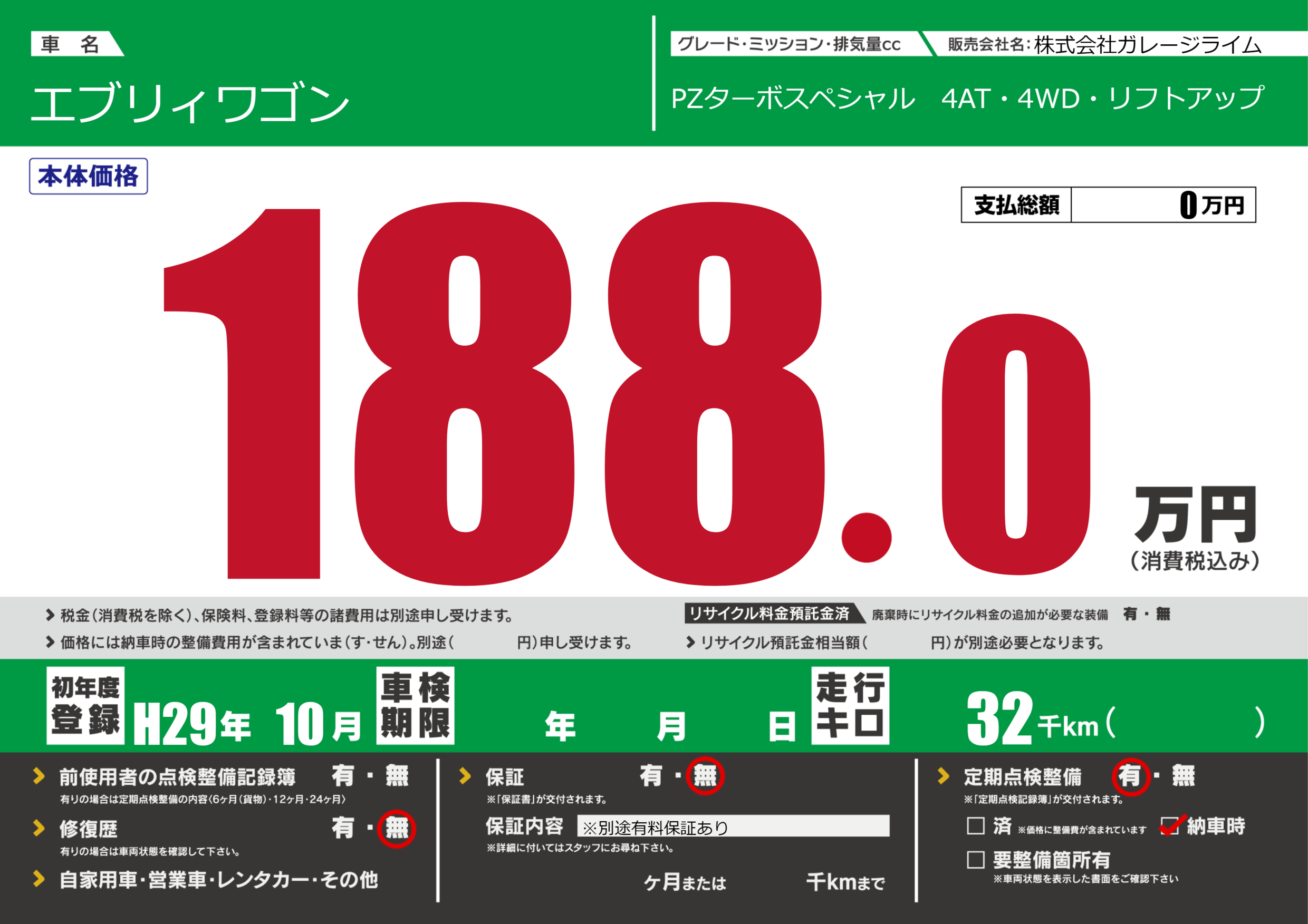 | 車名 | エブリィワゴン | グレード ミッション 排気量 |