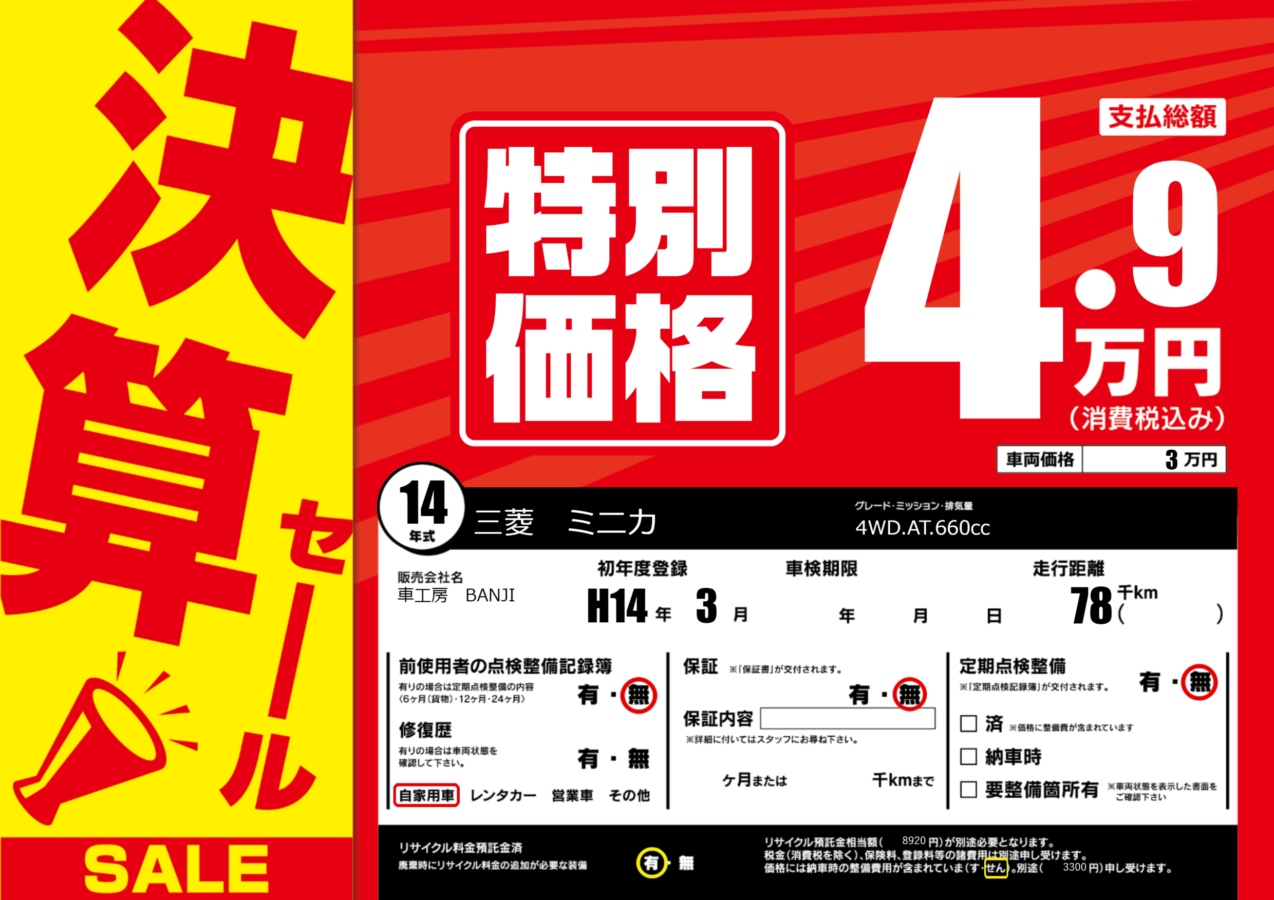 | 走行キロ | 7.8万km | 初年度登録 | H14年3月 |