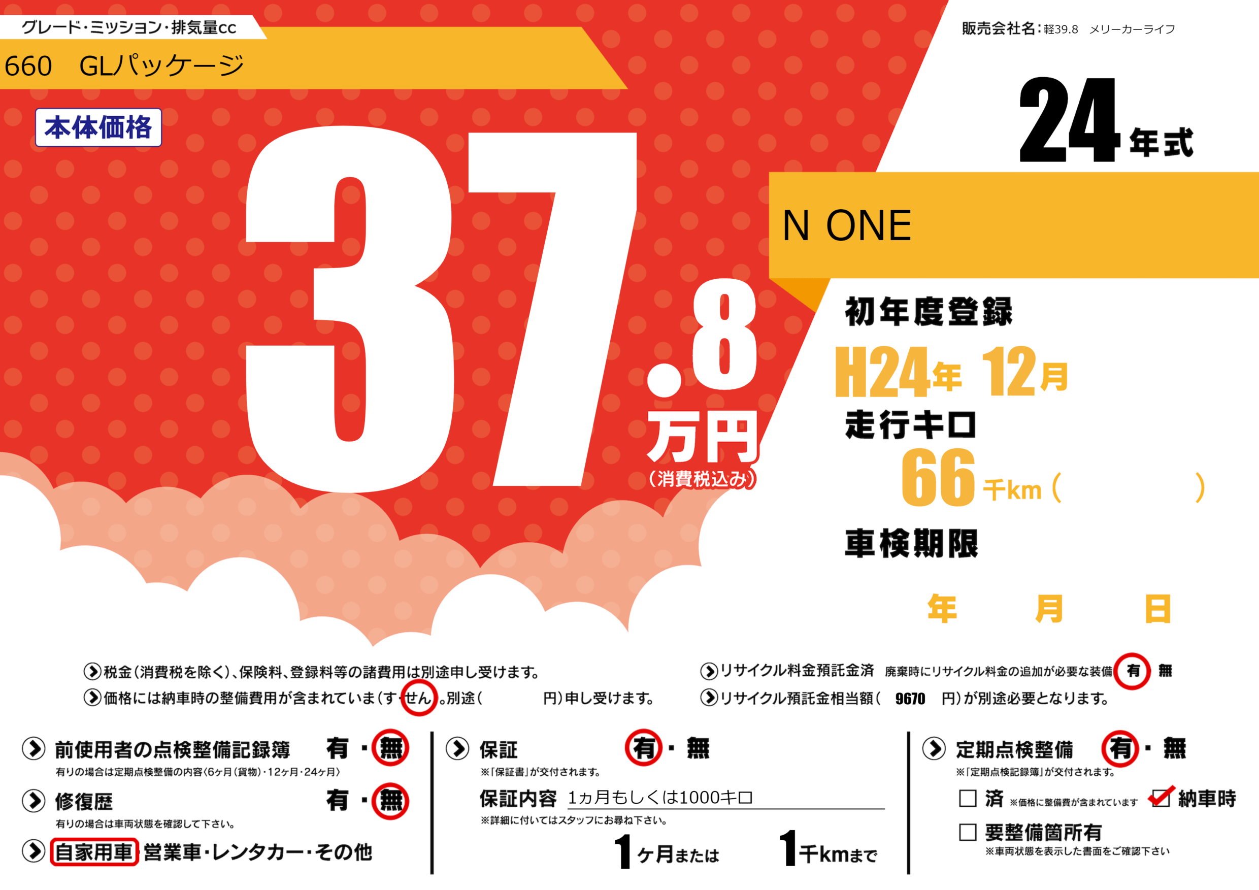| 車名 | N ONE | グレード ミッション 排気量 |