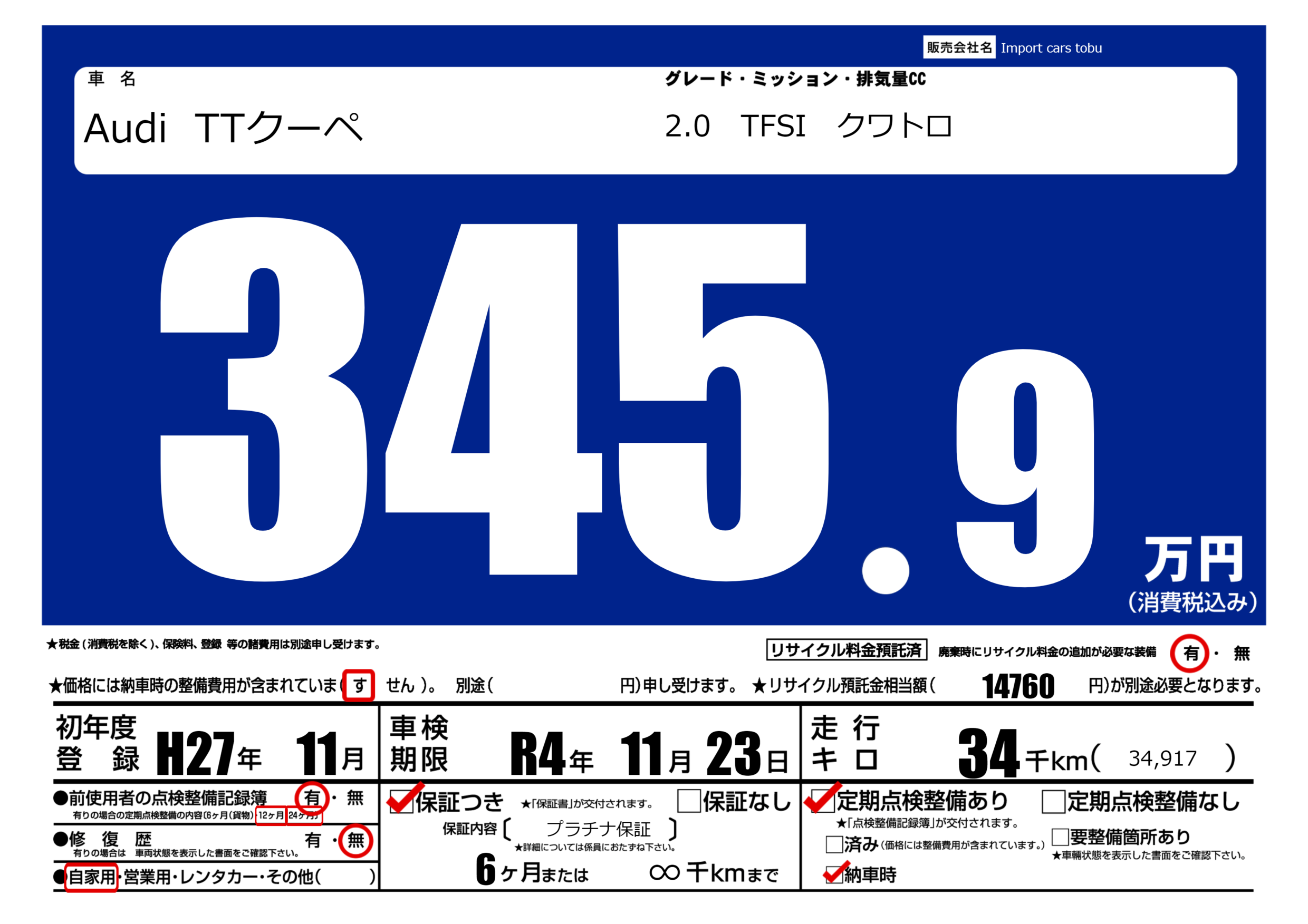 保証付き 保証内容( プラチナ保証) 6ヶ月または(∞)千kmまで |
