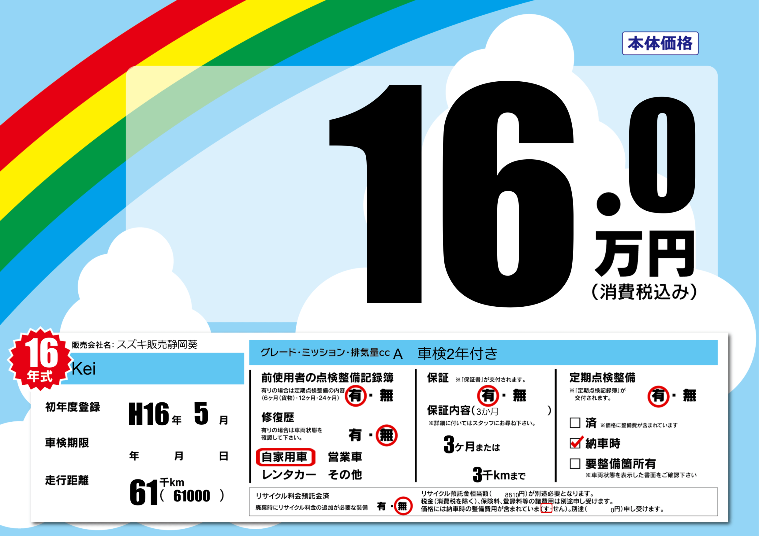 | 走行キロ | 6.1万km | 初年度登録 | H16年5月 |