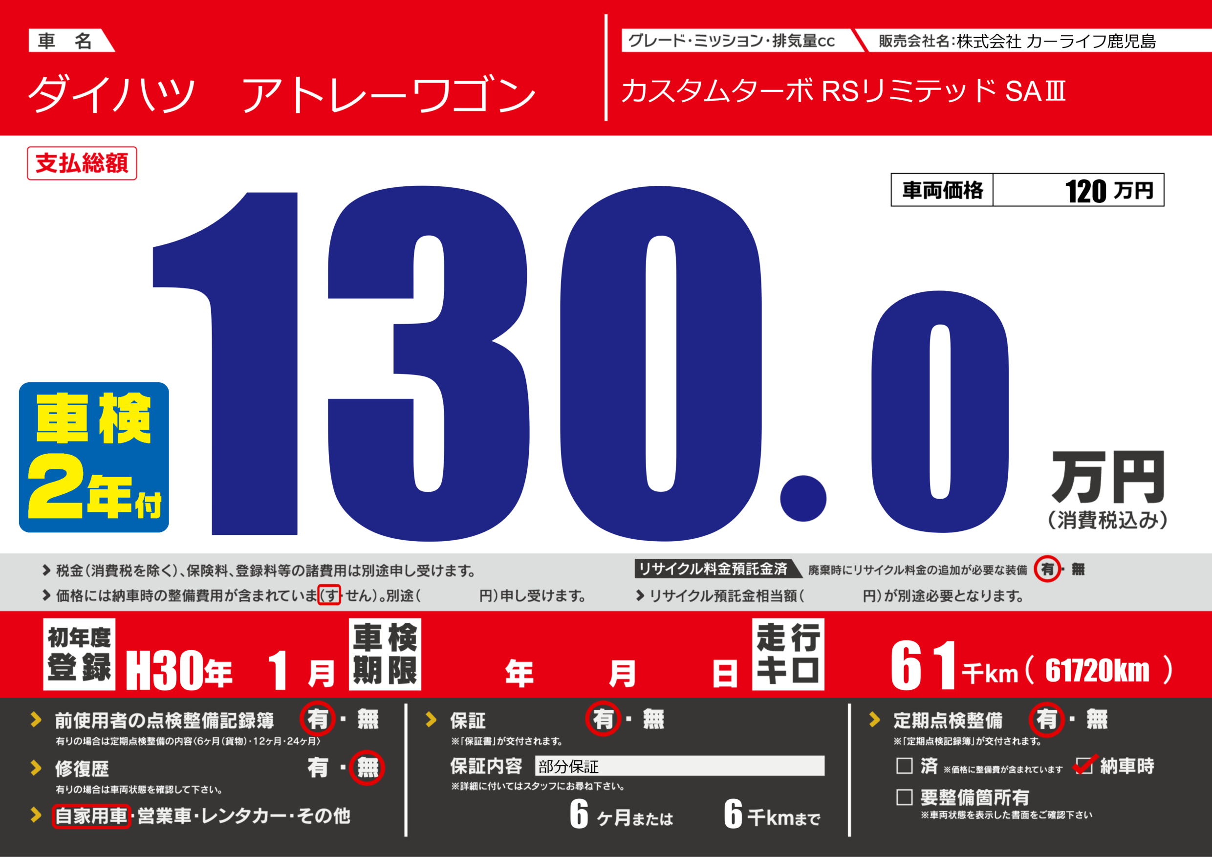 | 走行キロ | 0.6万km | 初年度登録 | H30年1月 |