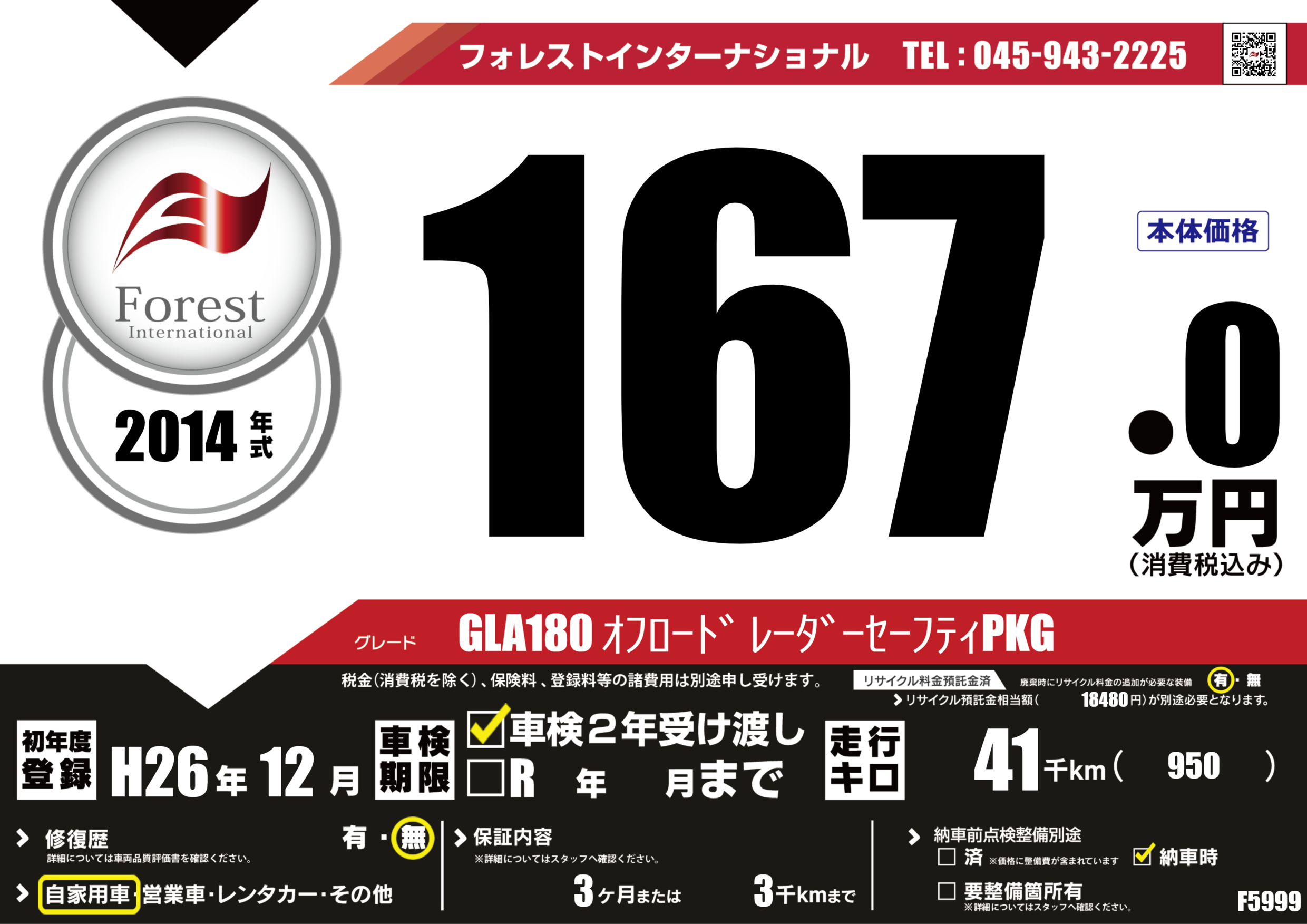 | 走行キロ | 4.1万km | 初年度登録 | H26年12月 |