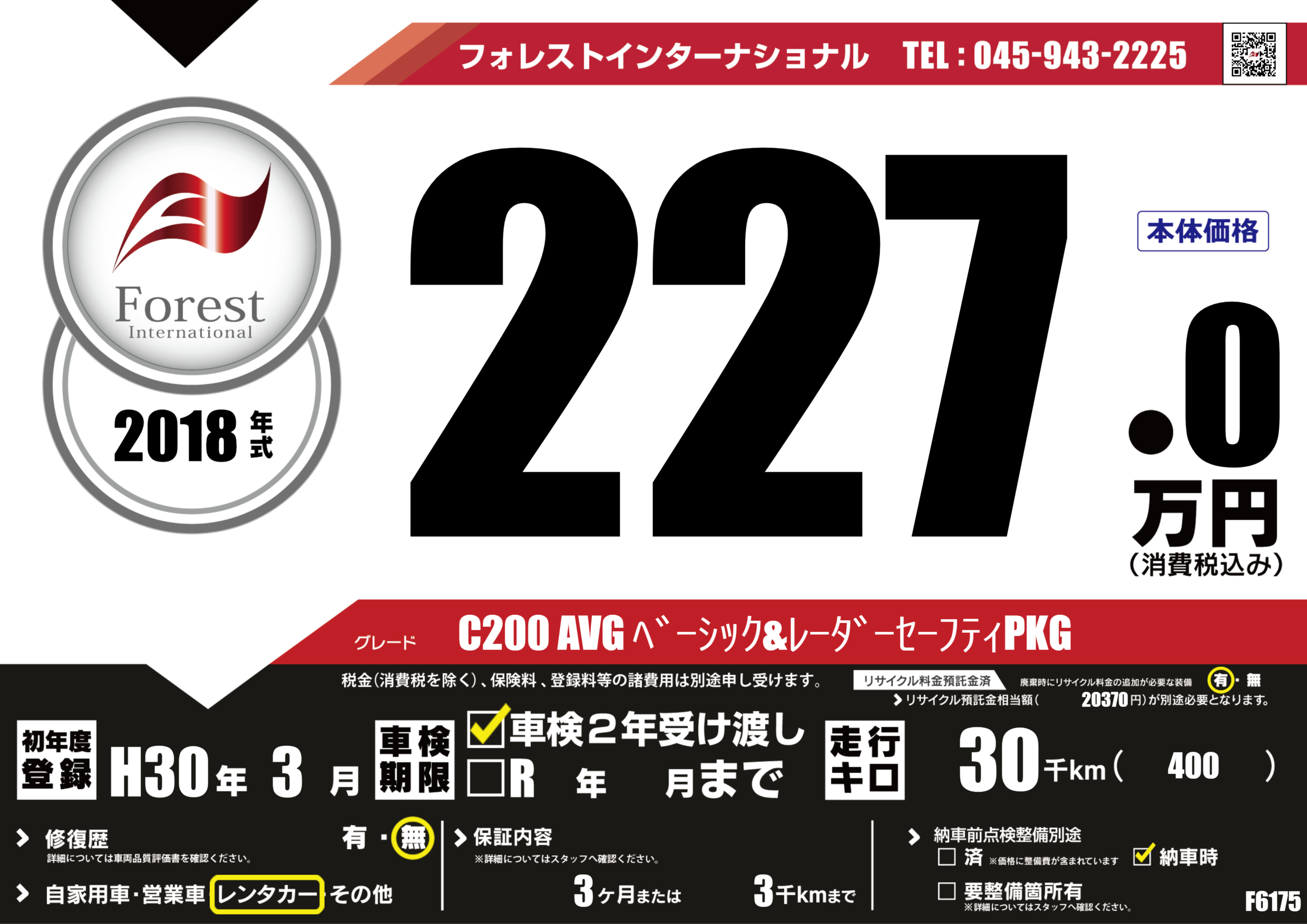 | 走行キロ | 3万km | 初年度登録 | H30年3月 |