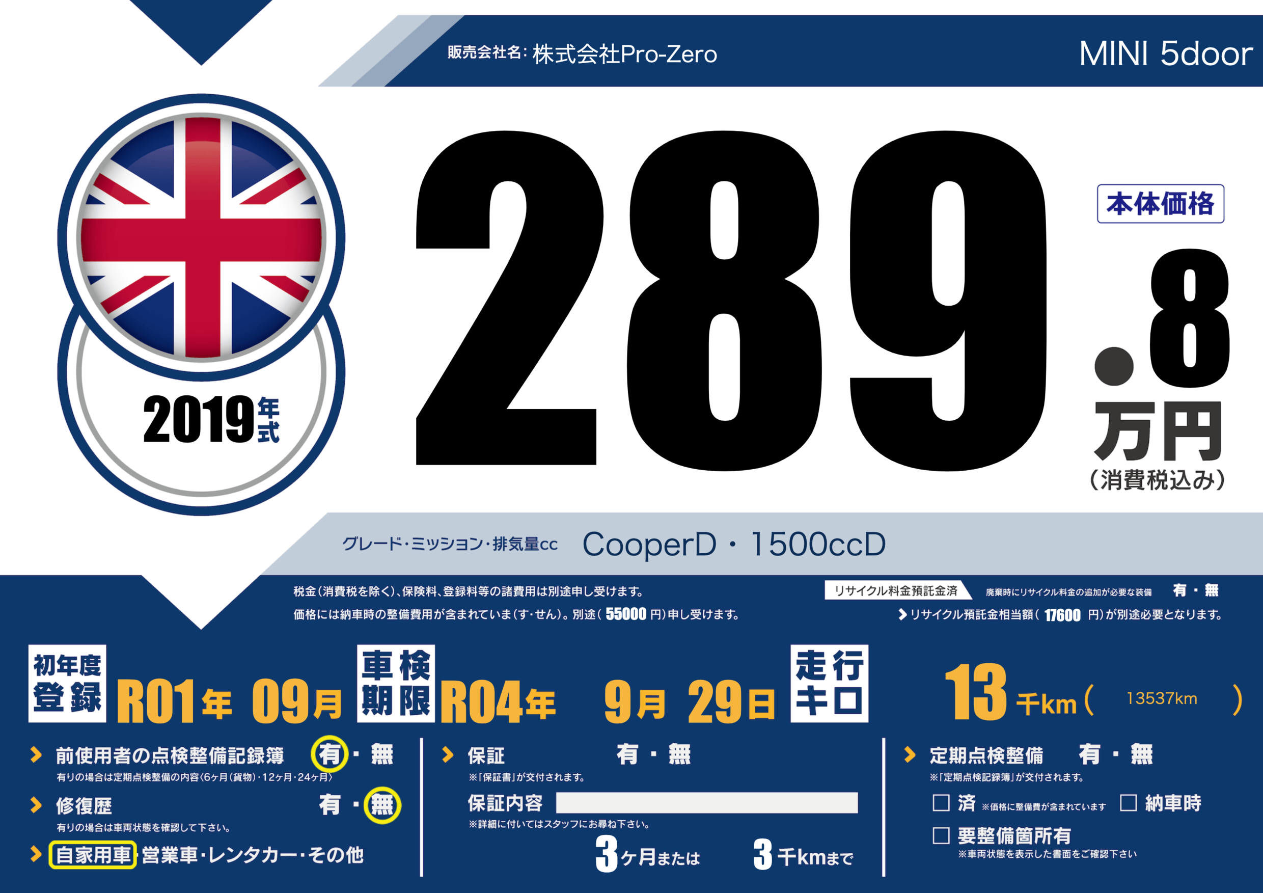 | 車名 | MINI 5door | グレード ミッション 排気量 |