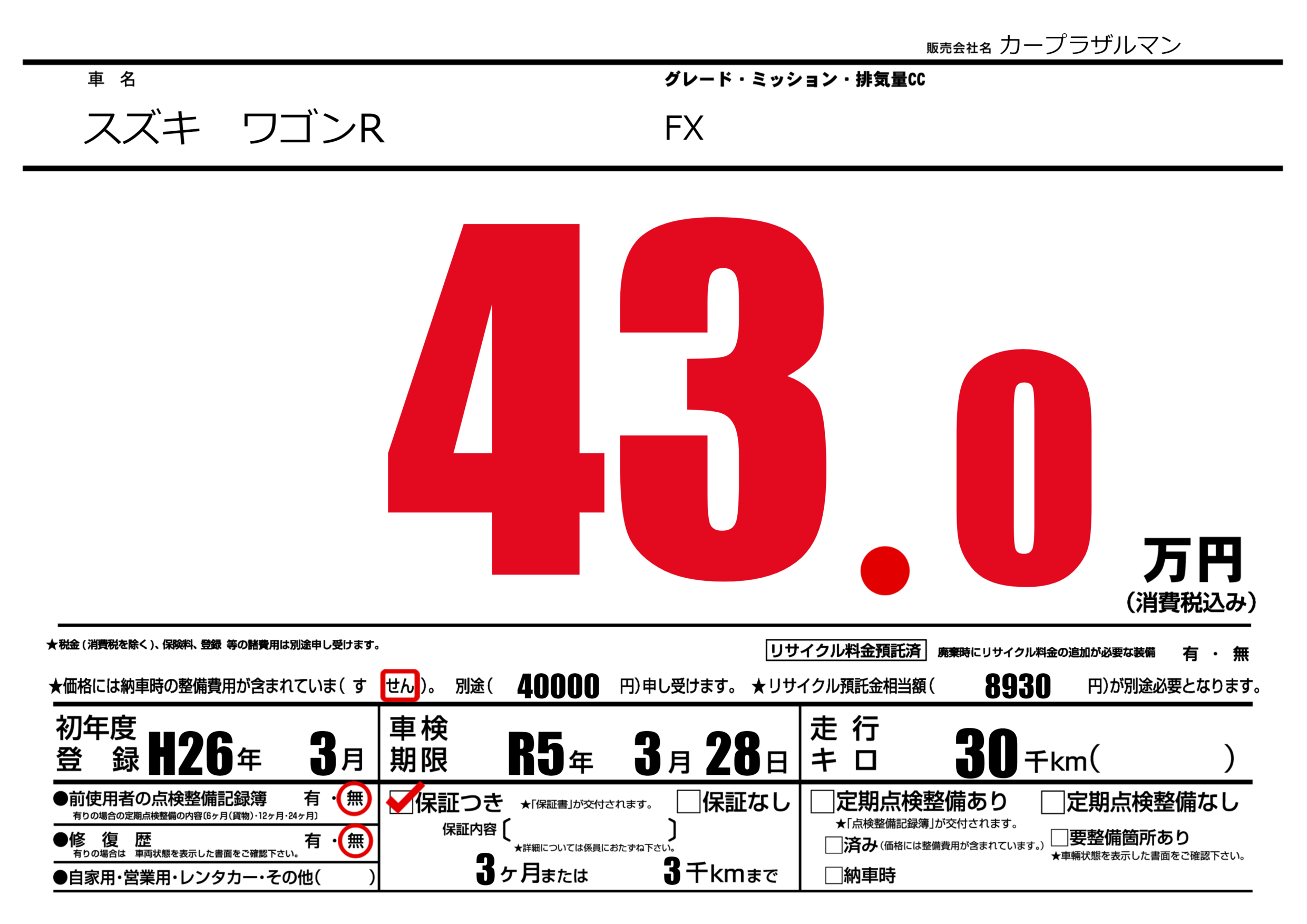 保証付き 保証内容(---) 3ヶ月または(3)千kmまで |